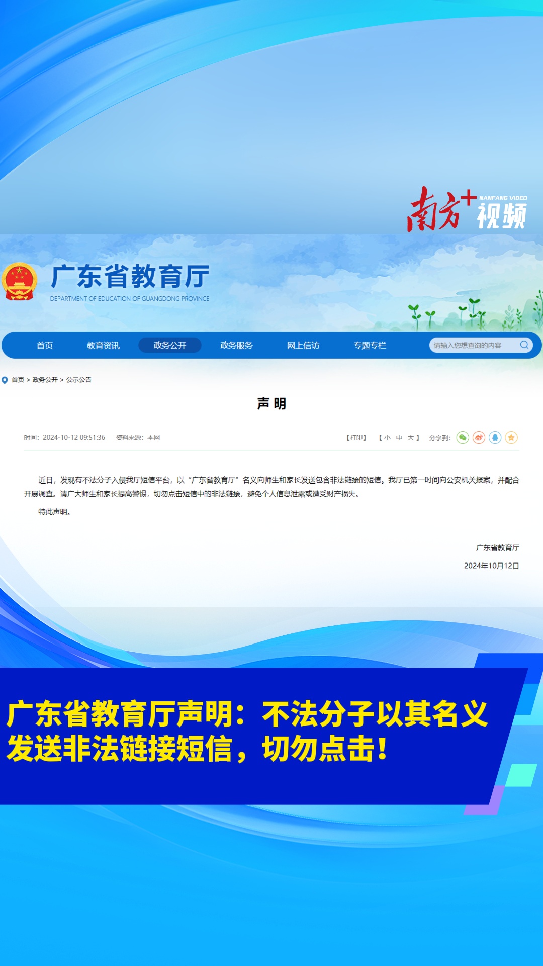 广东省教育厅声明:不法分子以其名义发送非法链接短信,切勿点击!