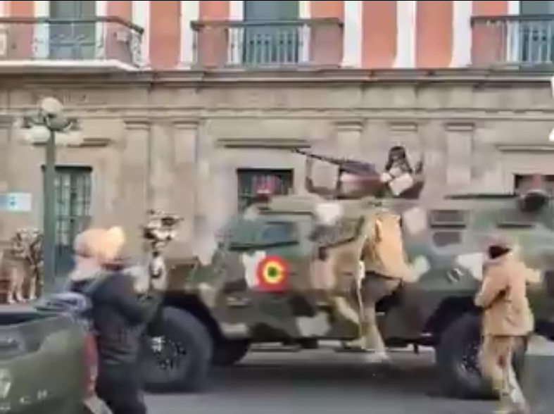 根据总台记者消息,有坦克及军队闯入玻利维亚拉巴斯总统府。玻利维亚前陆军司令官祖尼加表示,他将在占领总统府后接管政府组建新内阁。玻利维亚总统阿尔塞与祖尼加对质,并命令他遣散部队。
