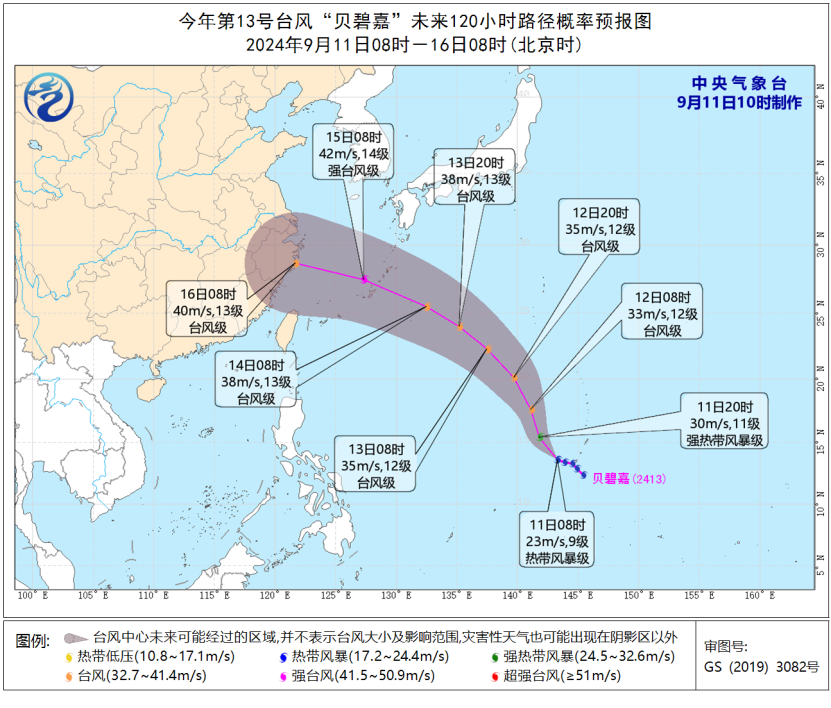 中央气象台预计,“贝碧嘉”将以每小时20-25公里的速度向西北方向移动,强度逐渐增强,趋向我国东海海面。中央气象台制作的“贝碧嘉”9月11日8时-16日8时路径概率预报图显示,台风“贝碧嘉”或将在9月16日于华东登陆。