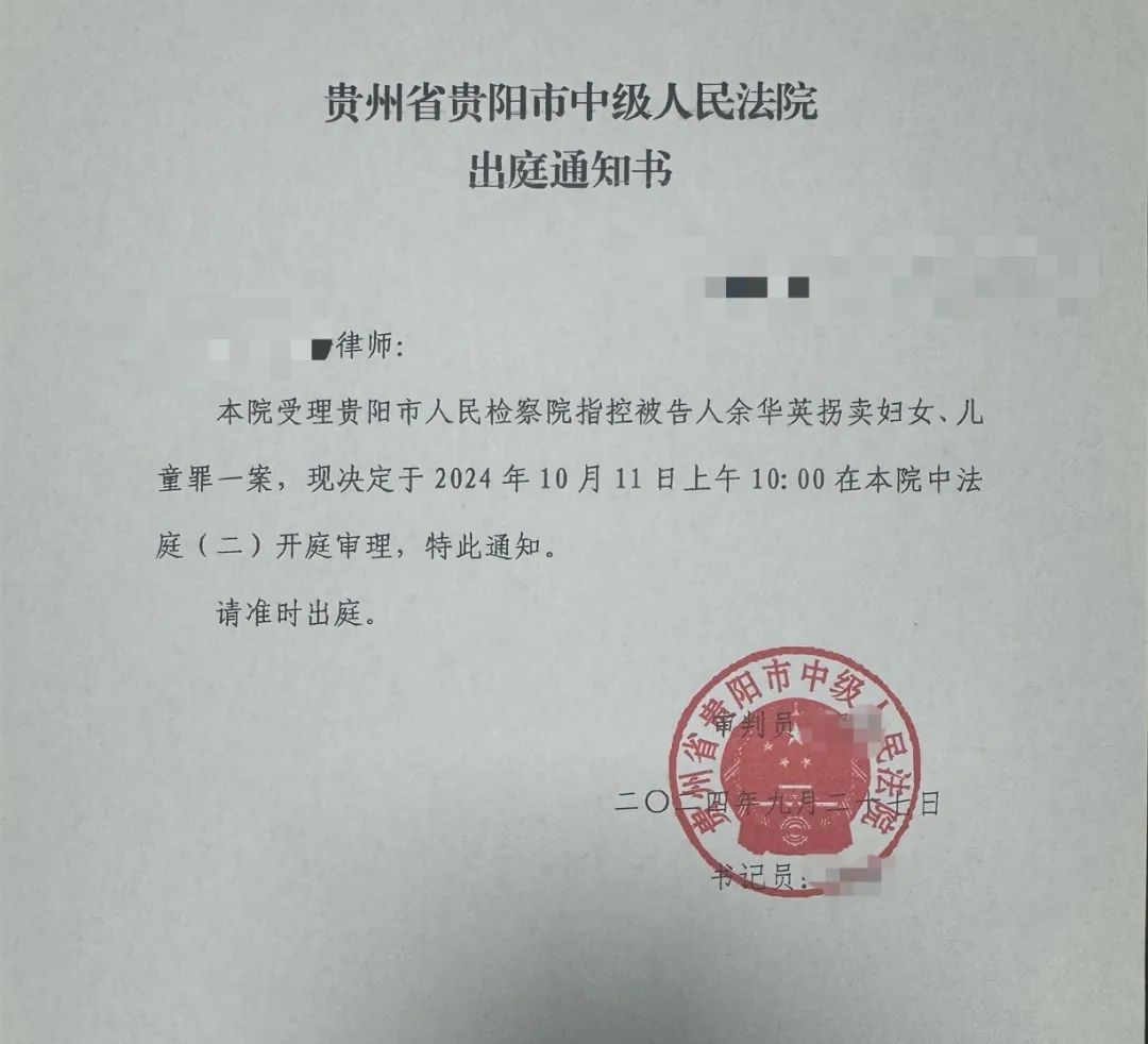 余华英拐卖儿童案重审开庭通知书。图/受访者