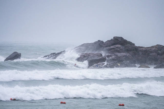 9月1日15时许,深圳市大鹏新区东涌沙滩,大风不断携着雨向岸边刮去,海浪汹涌。记者 董天健 见习记者 钟志辉 摄