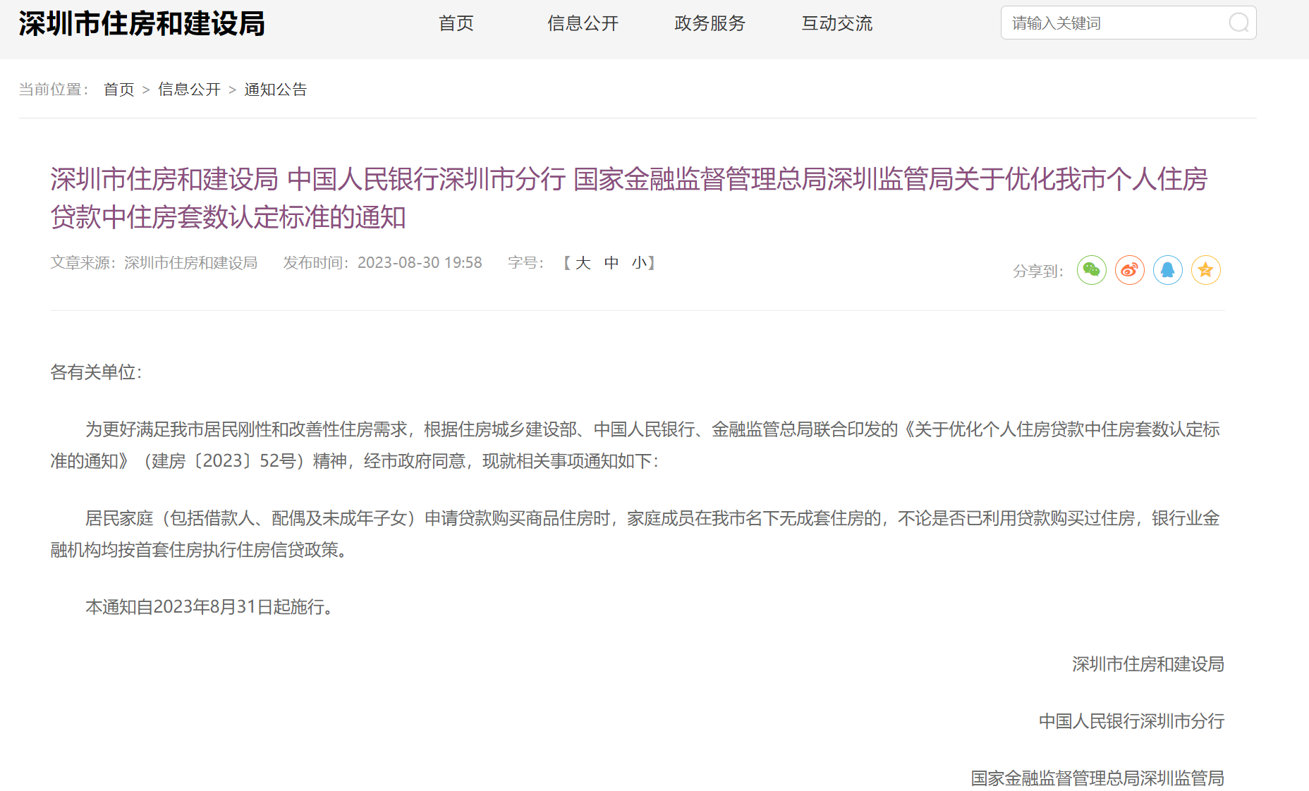 深圳市住房和建设局、中国人民银行深圳市分行、国家金融监督管理总局深圳监管局30日晚发出通知,为更好满足深圳市居民刚性和改善性住房需求,根据住房城乡建设部、中国人民银行、金融监管总局联合印发的《关于优化个人住房贷款中住房套数认定标准的通知》精神,经市政府同意,现就相关事项通知如下: