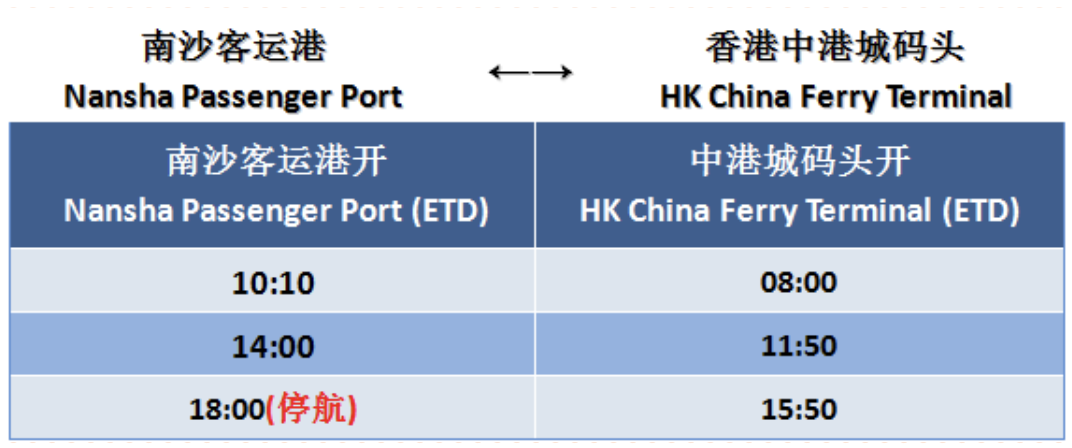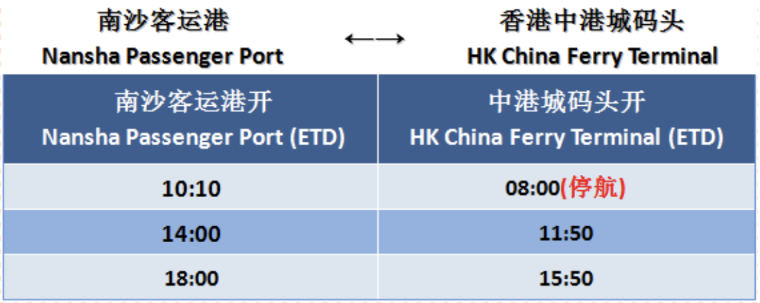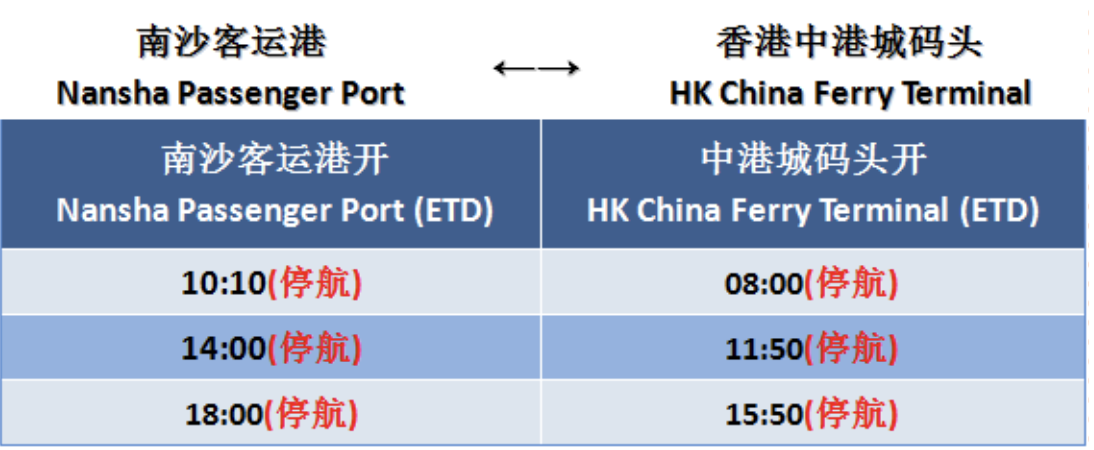8月31日下午,南沙客运港发布航班公告,受台风“苏拉”影响,南沙客运港至香港中港城线2023年8月31日18:00时起至9月4日8:00时止期间所有航班暂停营运,具体停航航班时间如下: