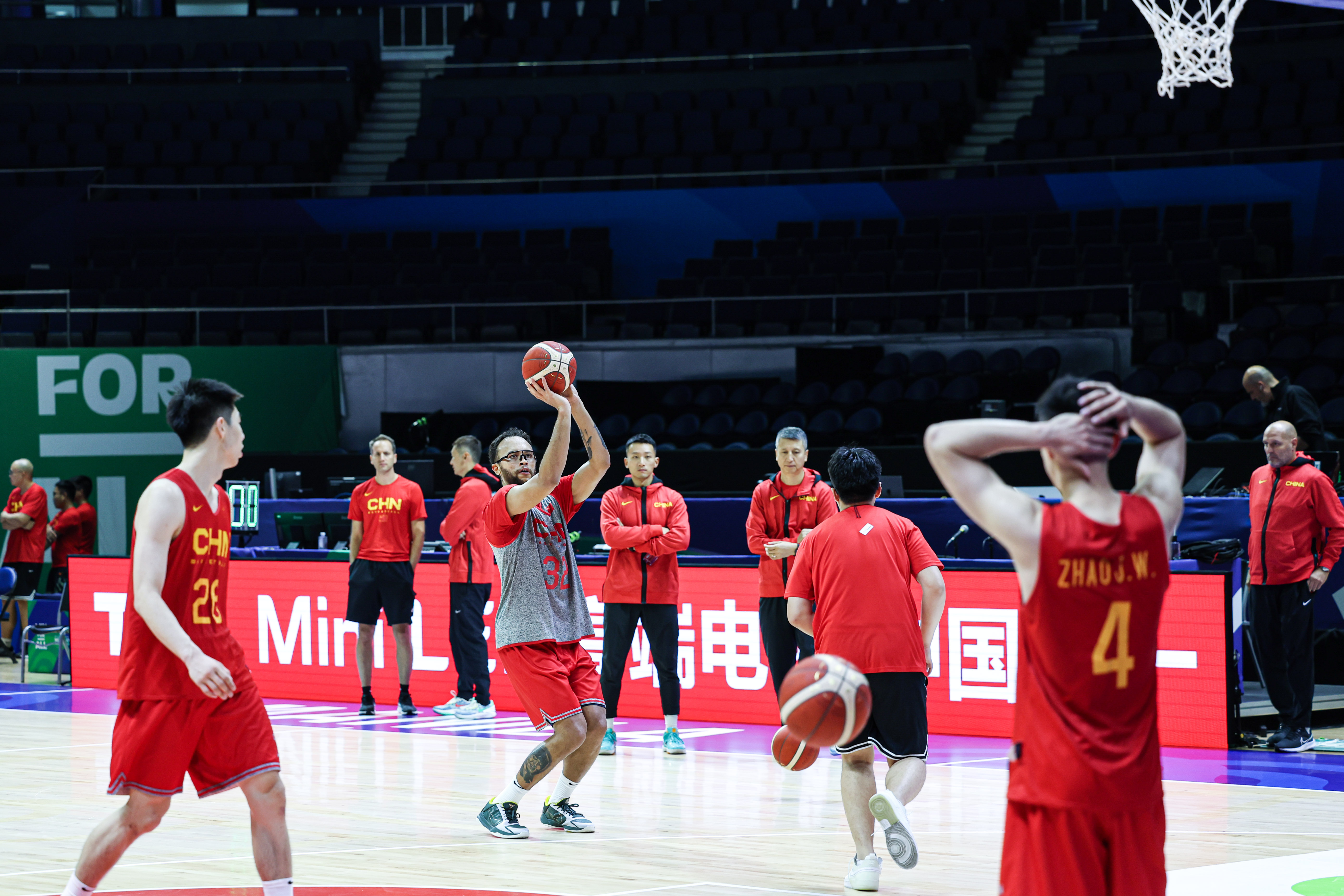 中国男篮在菲律宾首都马尼拉阿拉内塔体育馆进行赛前训练。