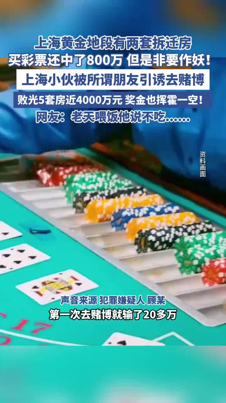 上海的顾某10年前拆迁获两套黄金地段房产,且在而立之年连中2次彩票大奖,小奖也不断,攒下近千万身价。但他遭遇“杀猪盘”,沉迷赌博输光积蓄,父母被迫卖掉两套房产填窟窿。没想到他2022年再中800万大奖竟挥霍一空,为维持奢靡生活以投资为名诈骗近400万,连坑亲友三套房。多年来顾某败光家里5套房总价值近4000万,今年2月他被上海宝山警方抓获,警车上竟称“能还钱”。详情>>
