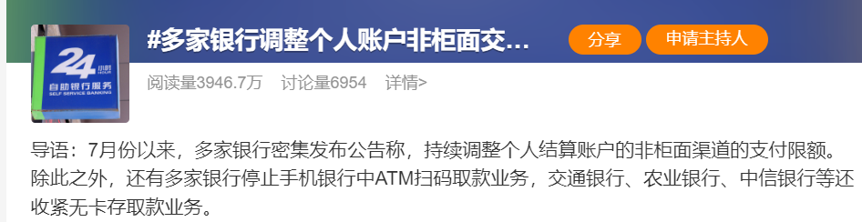 “突然发现,我转账额度被降低了!给我妈转大额转不了了……”王女士在社交媒体上的“吐槽”,引发了不少网友的共鸣,多位网友表示,最近也有被“降额”的经历。而“交易限额被调降”的相关话题,也成为了近期的热搜话题。