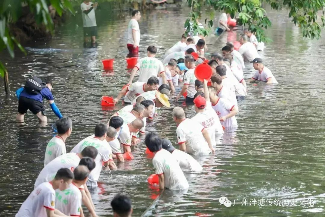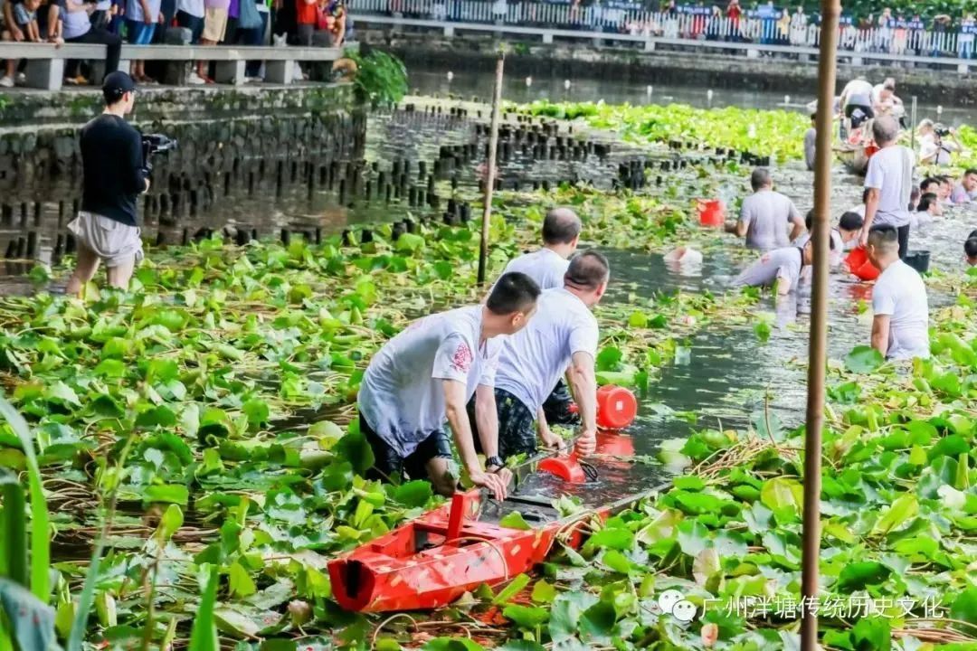 上午9时许,泮塘首二三四五约村民分工抬旗帜、祭品、龙船鼓、工具等,从乡约会所出发前去位于泮塘荔湾湖内的龙船窦,准备请龙出水。
