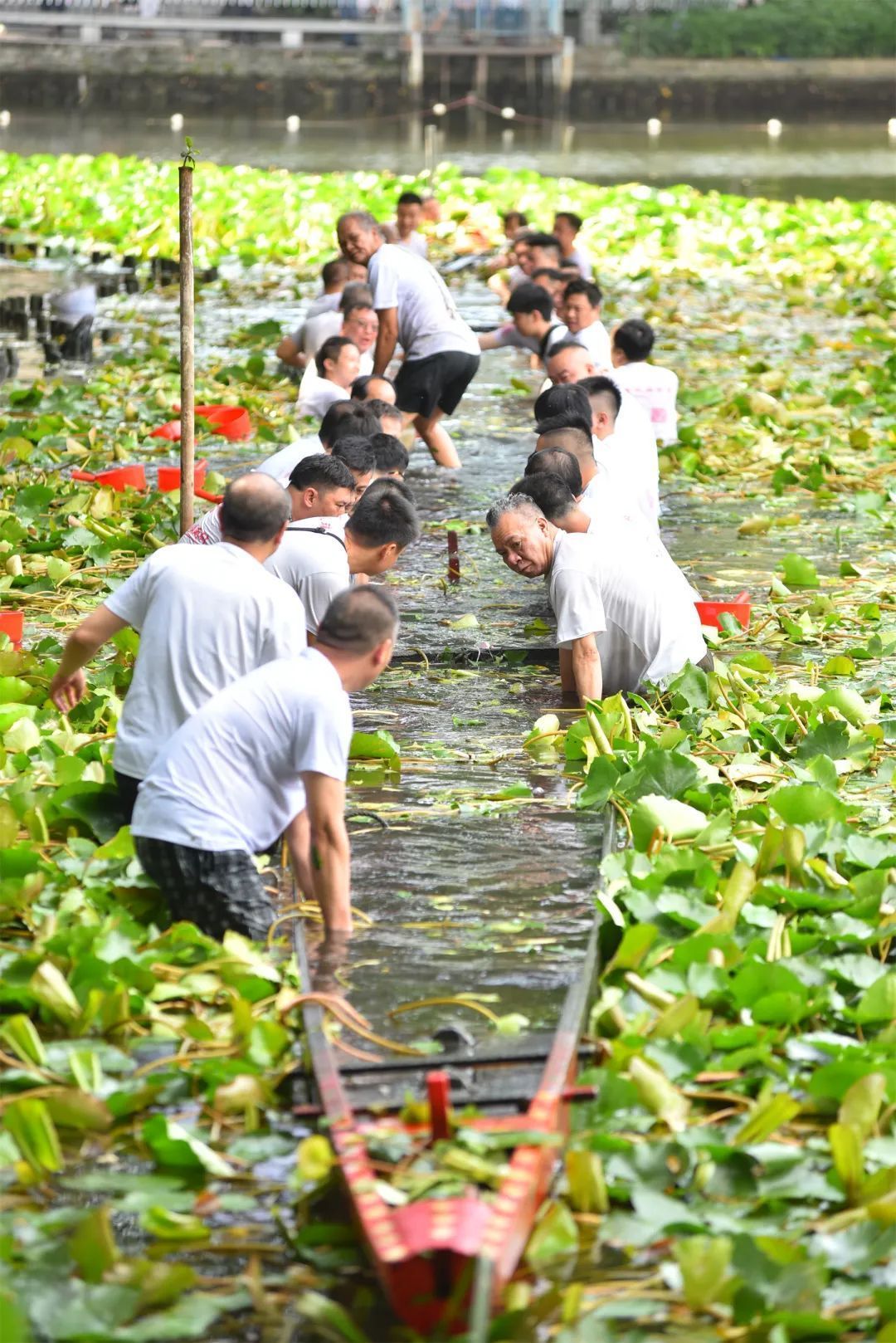 到达“龙船窦”后,众人将工具用品摆放好,完成相关的祭拜仪式后,随着泮塘老叔父一声令下,青壮年村民陆续跳入水中,先将积压龙船舱内的泥沙掏出,再合力摇松龙船底的泥浆,龙船逐渐浮出水面。起龙后,村民们用布等工具,清理船上的淤泥等杂物。