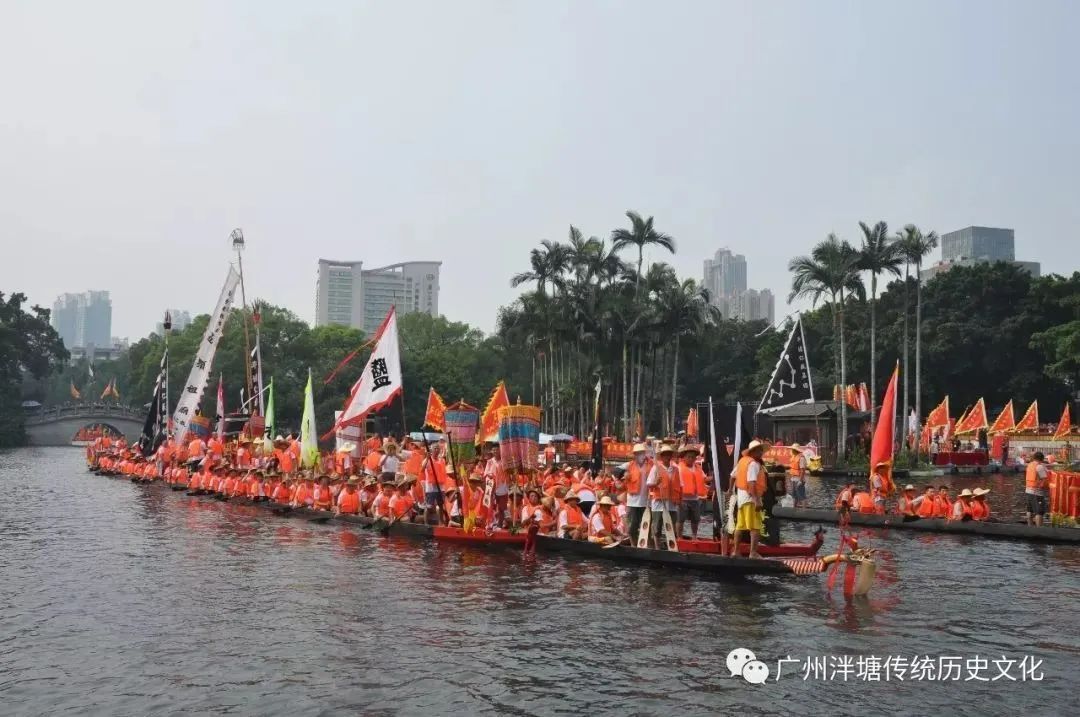 说起泮塘的龙船故事,就不得不提与盐步老龙“上契”的佳话。相传明万历年间,广州官府组织了龙舟比赛,已有100多岁的盐步龙舟与龙舟“后生仔”泮塘凸眼龙同场竞技,双方竞争激烈,就在盐步龙舟即将夺标之际,泮塘龙舟上的一个小伙子忽然腾空鱼跃,飞身夺得锦旗。