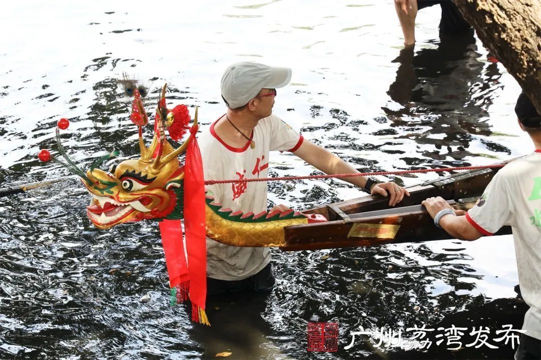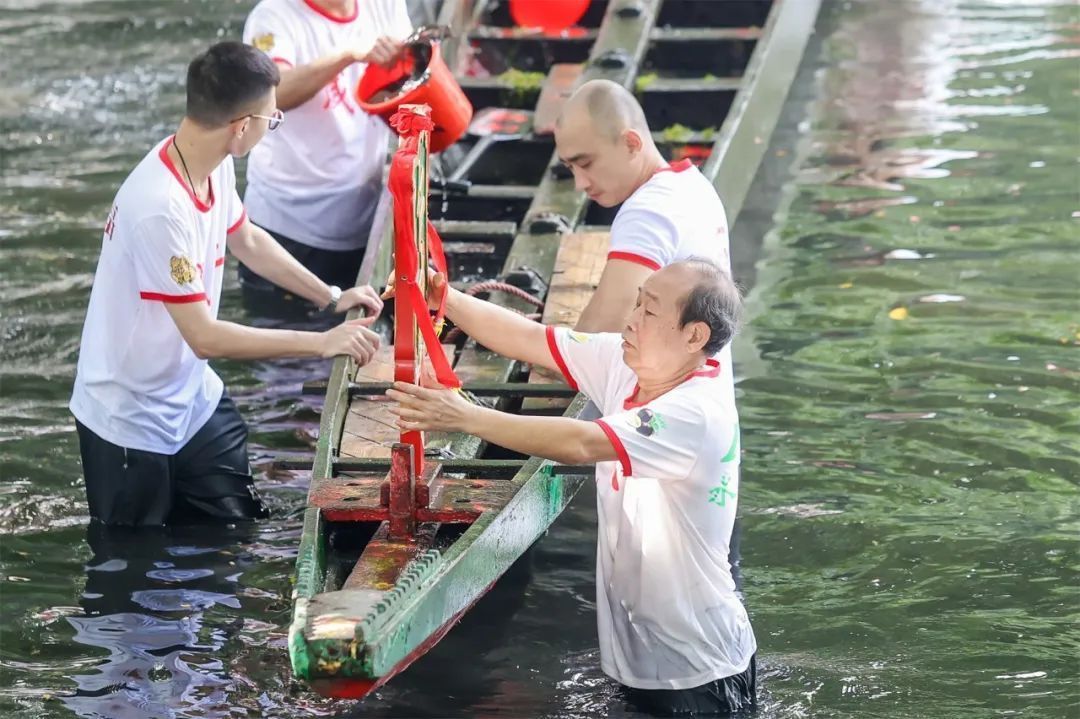 龙船清理完后,青壮年细心地为龙船装上龙头龙尾,将龙船鼓放到龙船上,“藏身”荔湾湖里一年的龙船焕然一新,神气昂然。