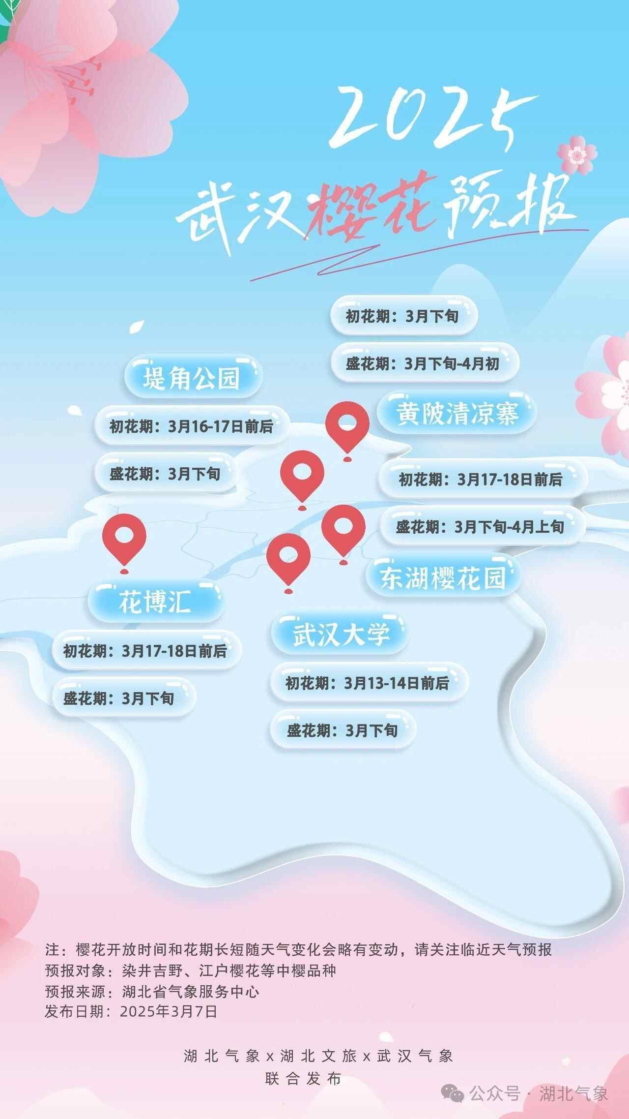 预计2025年武汉大学樱花(中樱)将在3月13-14日前后陆续开放,3月20日前后进入最佳观赏期,盛花期将持续5-7天,整个花期将持续到3月底。收藏好这份武汉樱花预报,有机会一起去赏樱花吧!