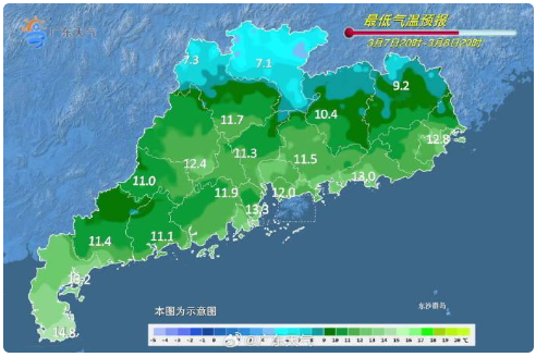 8日,广东省西部市县多云到阴天,有分散小雨,其余市县多云间晴。最低气温:粤北和珠江三角洲北部市县8~11℃,粤西沿海市县13~15℃,其余市县11~13℃。