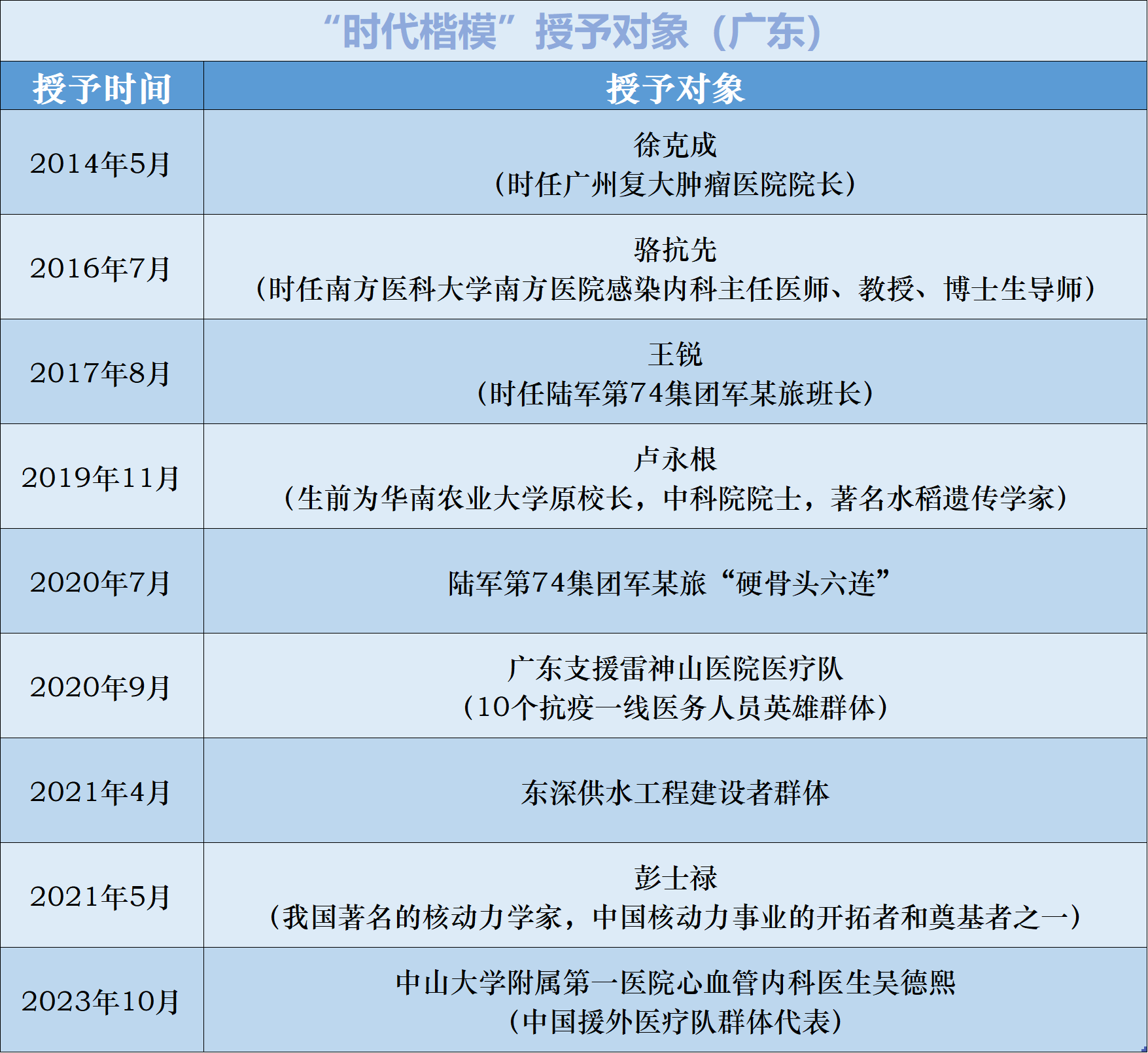 在第一年的“时代楷模”中,就开始出现来自广东的名字——时任广州复大肿瘤医院院长徐克成。此后,骆抗先、王锐、卢永根、“硬骨头六连”、广东支援雷神山医院医疗队、东深供水工程建设者群体、彭士禄、吴德熙……广东的“时代楷模”不断涌现。