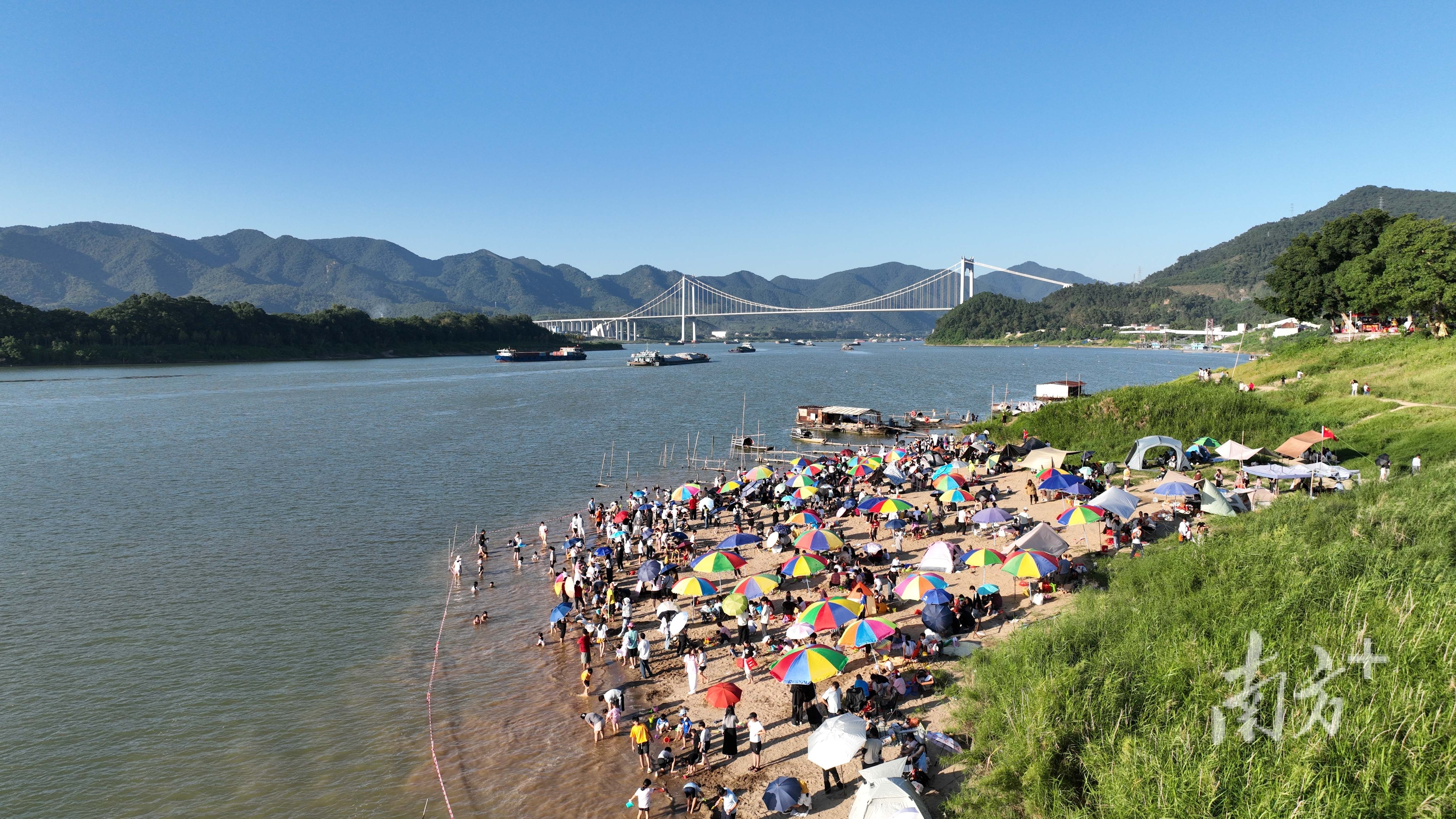 位于西江边的湾边村沙滩吸引了众多游客前来游玩。