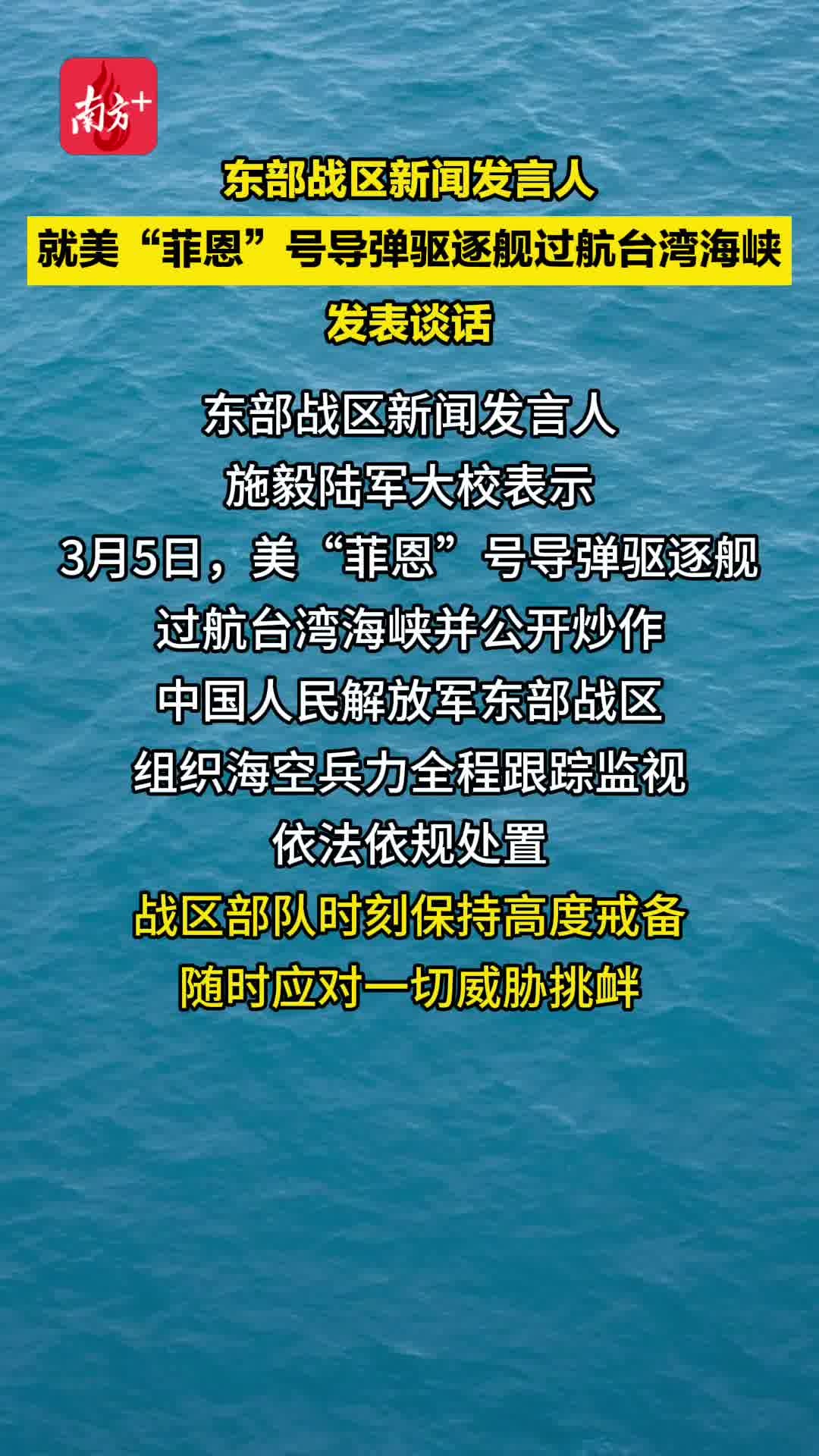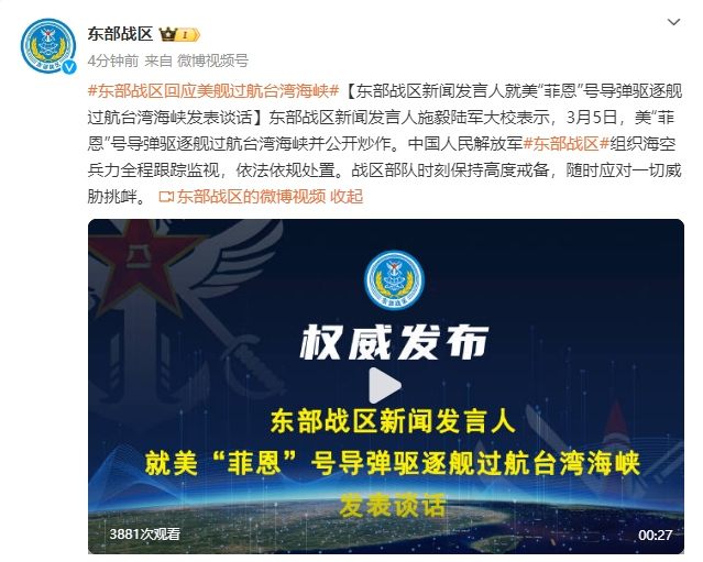 @东部战区微博消息,东部战区新闻发言人施毅陆军大校表示,3月5日,美“菲恩”号导弹驱逐舰过航台湾海峡并公开炒作。中国人民解放军东部战区组织海空兵力全程跟踪监视,依法依规处置。战区部队时刻保持高度戒备,随时应对一切威胁挑衅。