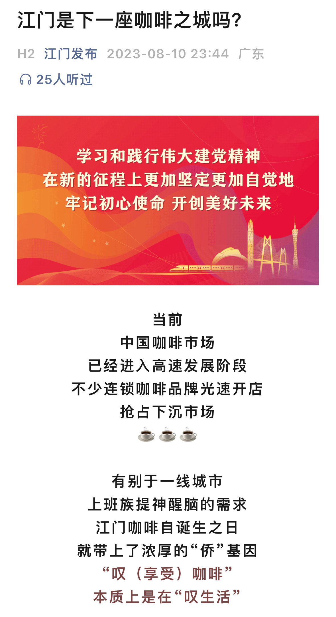 同样的城市官微上发布过此类文章的还有江门。“江门发布”曾发布文章《江门是下一座咖啡之城吗?》。数据显示,江门有着许多本地咖啡店,截至2023年底累计达到1580户。此前,相关协会刚刚宣布,第二届中国侨都(江门)咖啡文化周定档元宵,将于2月23日启动,并将持续到3月。