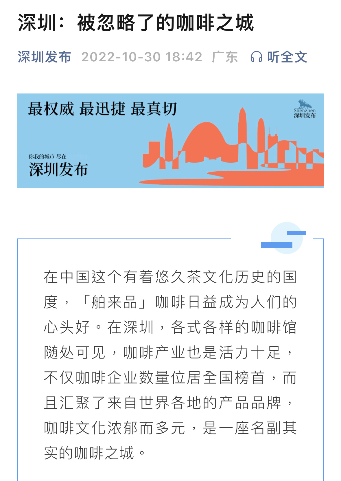 有意思的是,既不是国内历史上首先出现咖啡馆的,也不是第一个出现咖啡种植基地的城市深圳,就曾在深圳官微“深圳发布”上发布过一篇文章《深圳:被忽略了的咖啡之城》,解析活力十足的咖啡产业。
