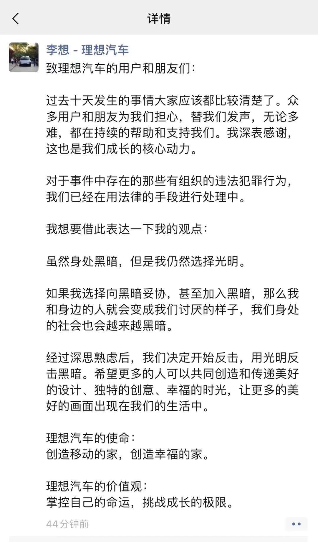 据悉,理想汽车CEO李想11日发朋友圈称,过去十天发生的事情大家应该都比较清楚了。众多用户和朋友为我们担心,替我们发声,无论多难,都在持续地帮助和支持我们。我深表感谢,这也是我们成长的核心动力。