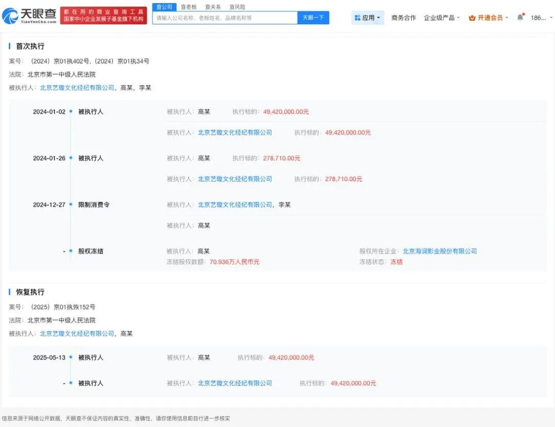 此外,董璇名下北京艺璇文化经纪有限公司现存一则恢复执行信息,执行标的4942万元,执行法院为北京市第一中级人民法院,涉及浙江唐德影视股份有限公司与北京艺璇文化经纪有限公司、高云翔相关演出合同纠纷案件。