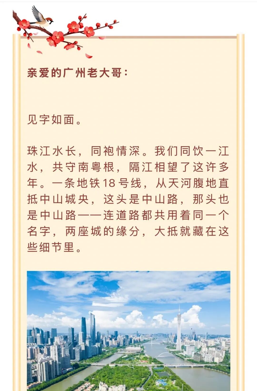 广州《致亲爱的中山吾弟》回复:“虾饺配乳鸽,早茶搭云吞,烟火滋味同源,这便是我们最踏实的情谊。”
