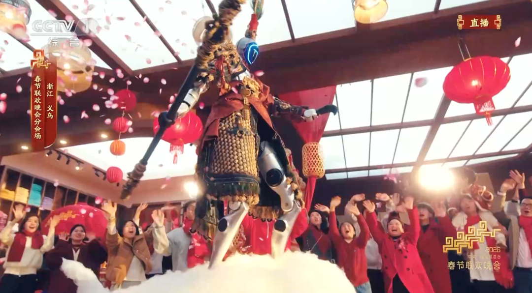 义乌分会场,演员张若昀与披上《黑神话:悟空》战袍的浙江新特产——宇树机器人热情互动。机器人化身“大圣”驾着“筋斗云”从天而降的画面,引得网友直呼惊艳。