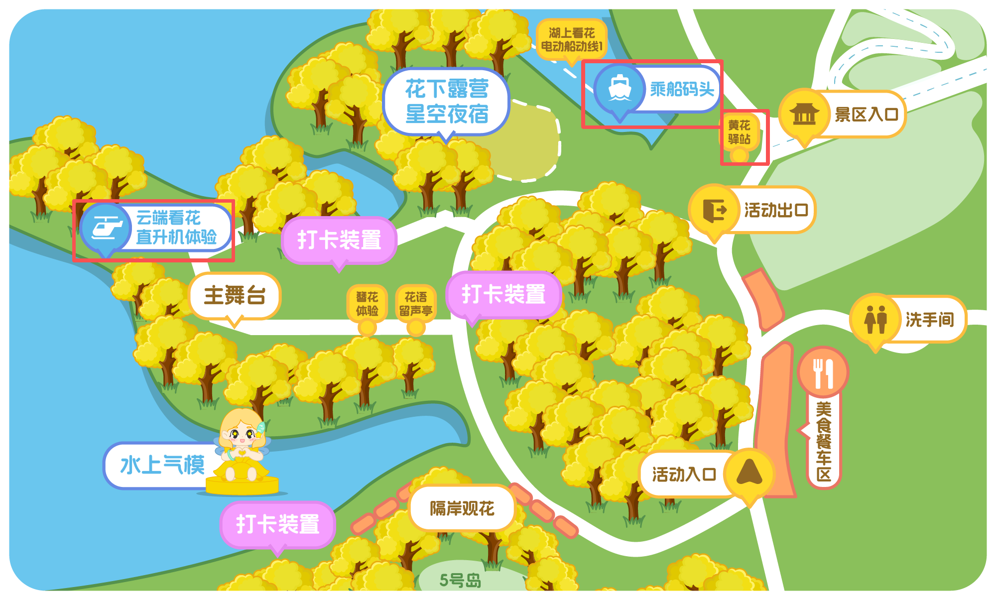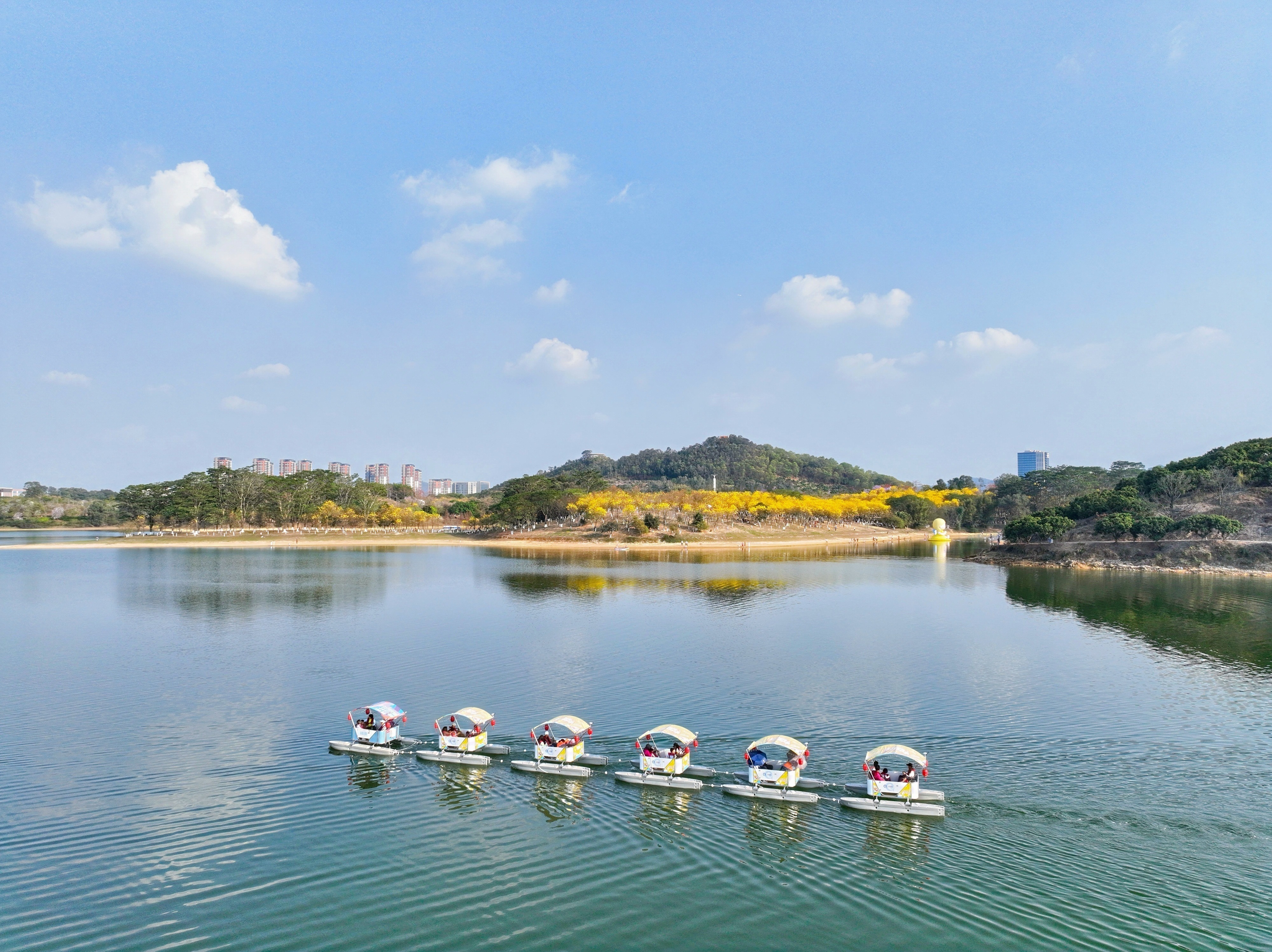 湖上看花·电动船引入小豚智能纯电动无人船,依托低噪音、零排放的优势打造绿色低碳的湖面游览体验,游湖动线同样串联黄花风铃木林与华为溪村,25分钟的行程可尽览湖岸花海风光。