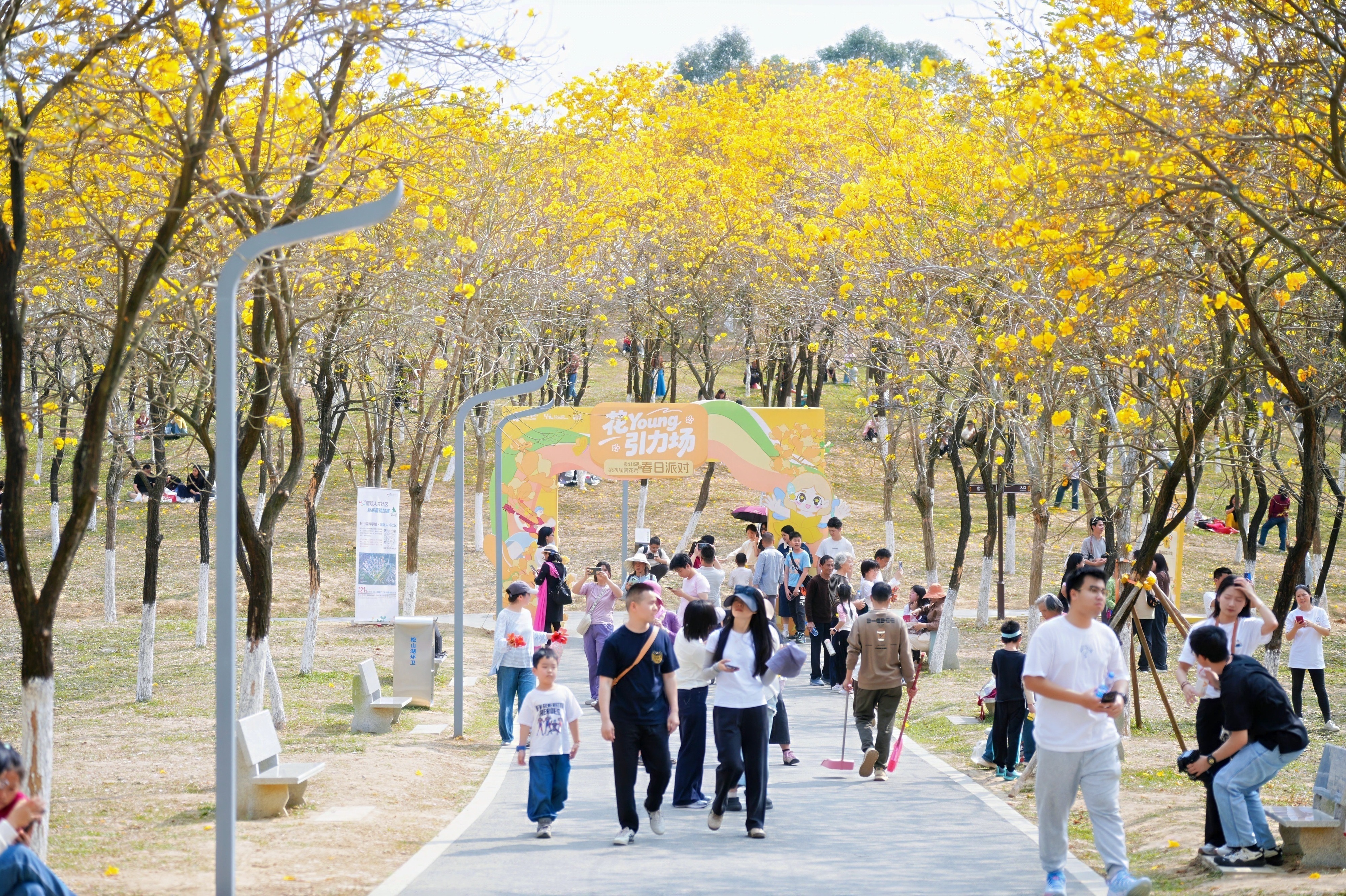 本届赏花月依托黄花风铃木生态资源,深度结合“湾区周末IN东莞”文旅品牌,通过丰富文旅产品供给、创新文旅消费场景、打造立体观景体验,进一步推动文旅消费升级,也为松山湖持续深化“科技+生态+人文”文旅融合发展模式写下生动注脚。