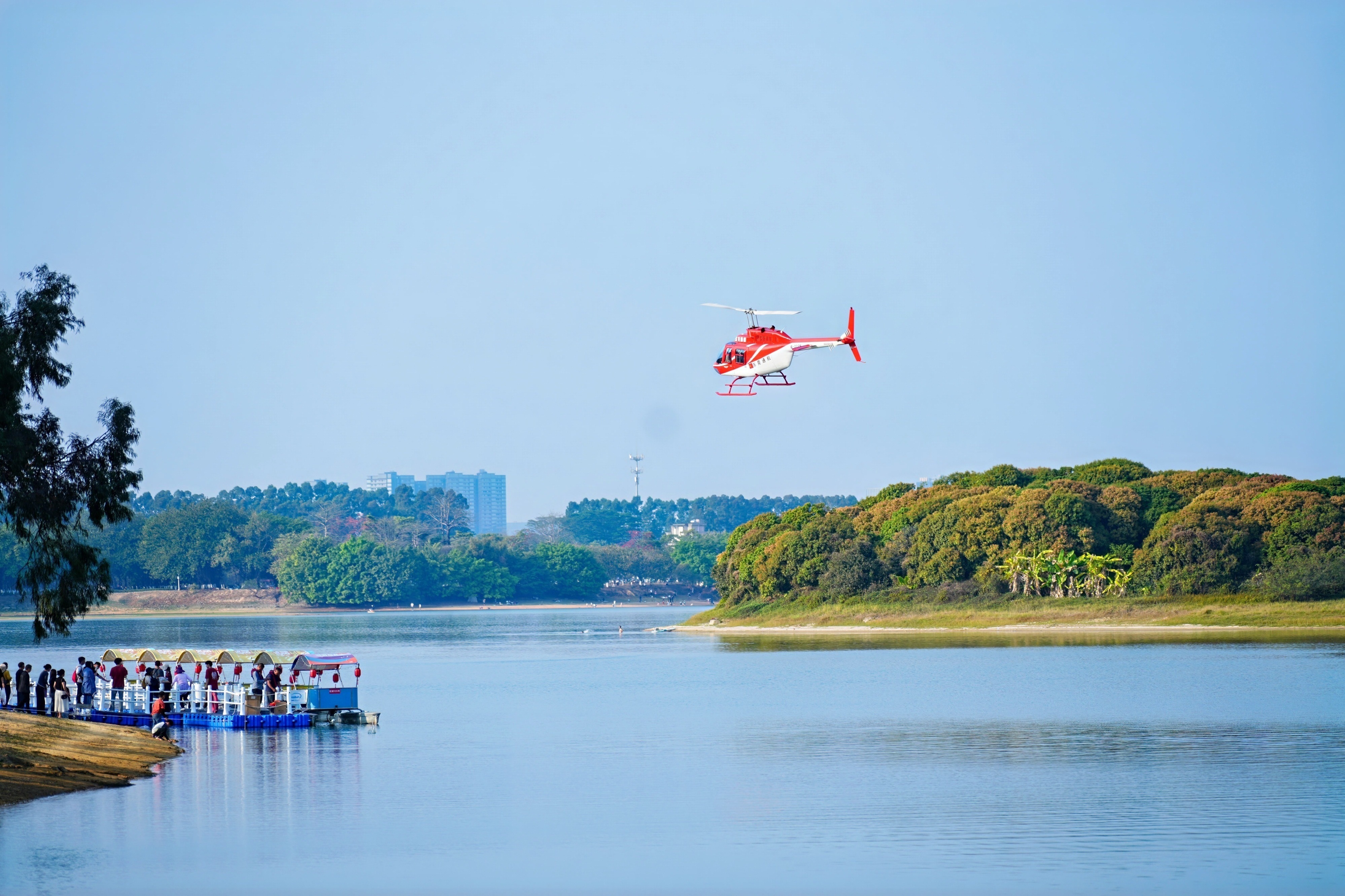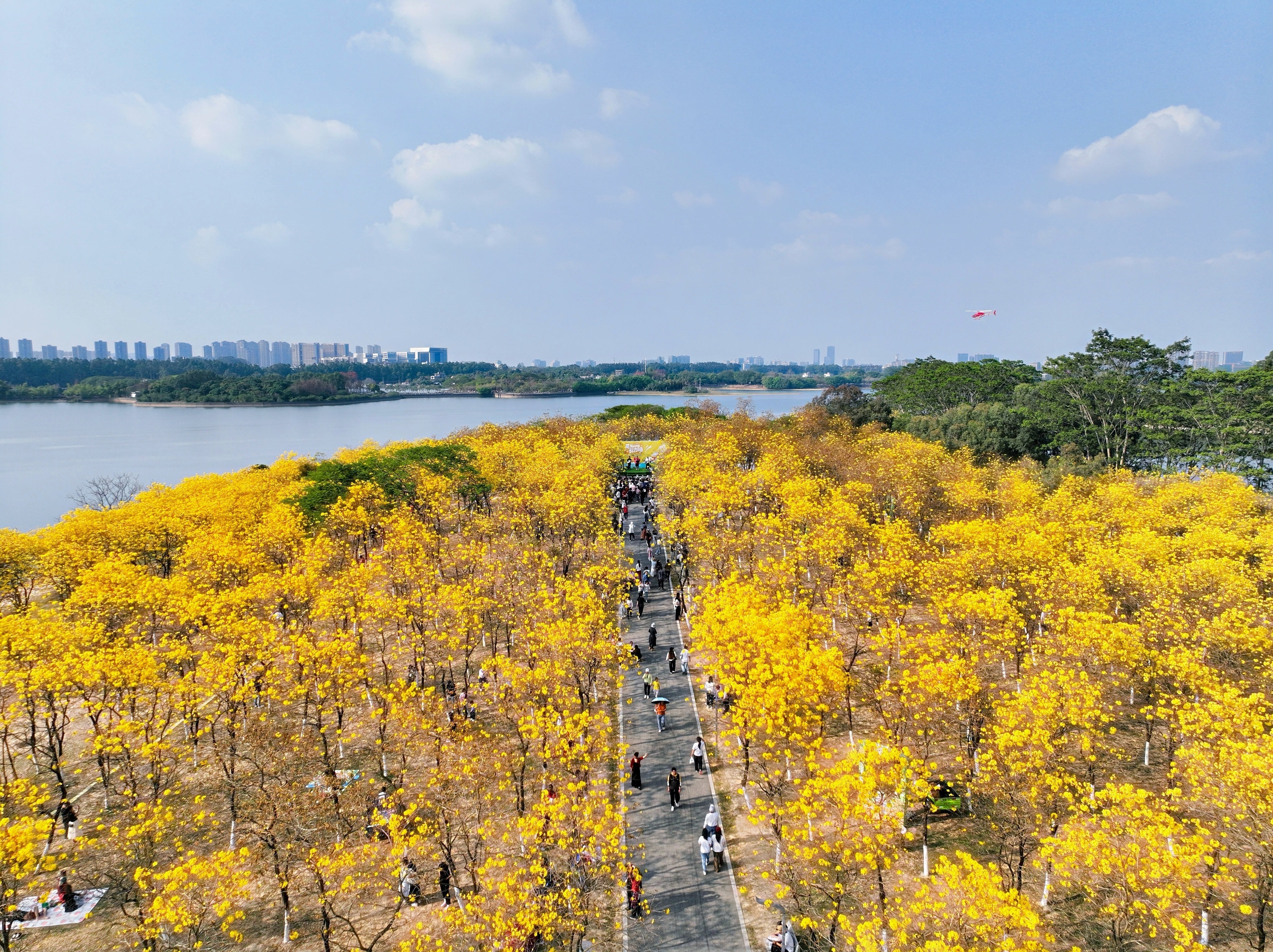 云端看花·直升机低空航线由东莞通航运营,飞行动线环绕黄花风铃木林与华为溪村,游客可升至百米低空,俯瞰金色花海与湖光山色交融的壮丽盛景。
