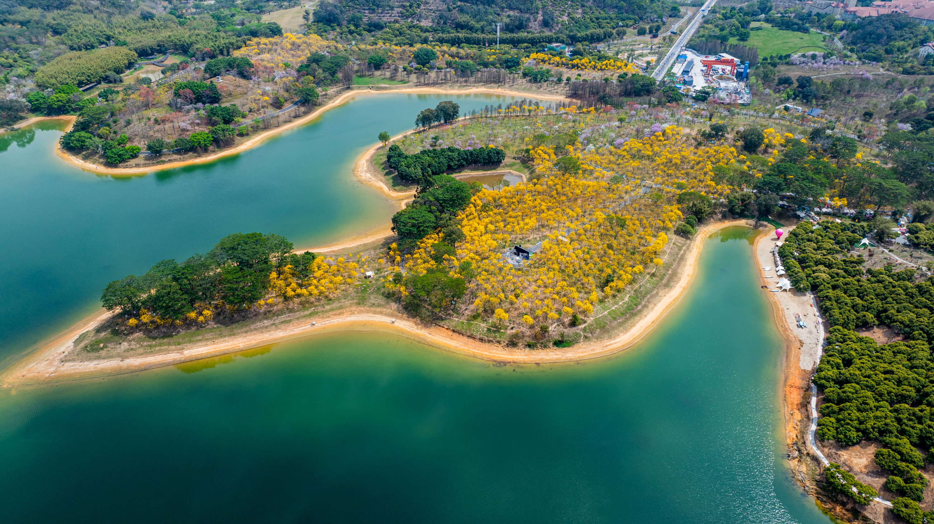 本届赏花月打破传统地面赏花模式,打造“空中+湖面+陆地”三维立体观景体系,创新文旅融合新形式,让游客从不同视角邂逅松山湖的春日之美。