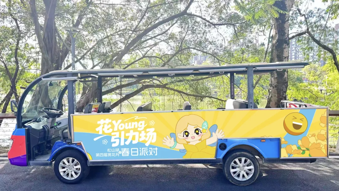 陆地看花·“花间风铃”观光车由松山湖商文旅公司运营,打造串联松山湖科学公园、黄花风铃木林的专属赏花动线,为游客赏花提供便捷的交通服务,轻松实现多景区联动游览。