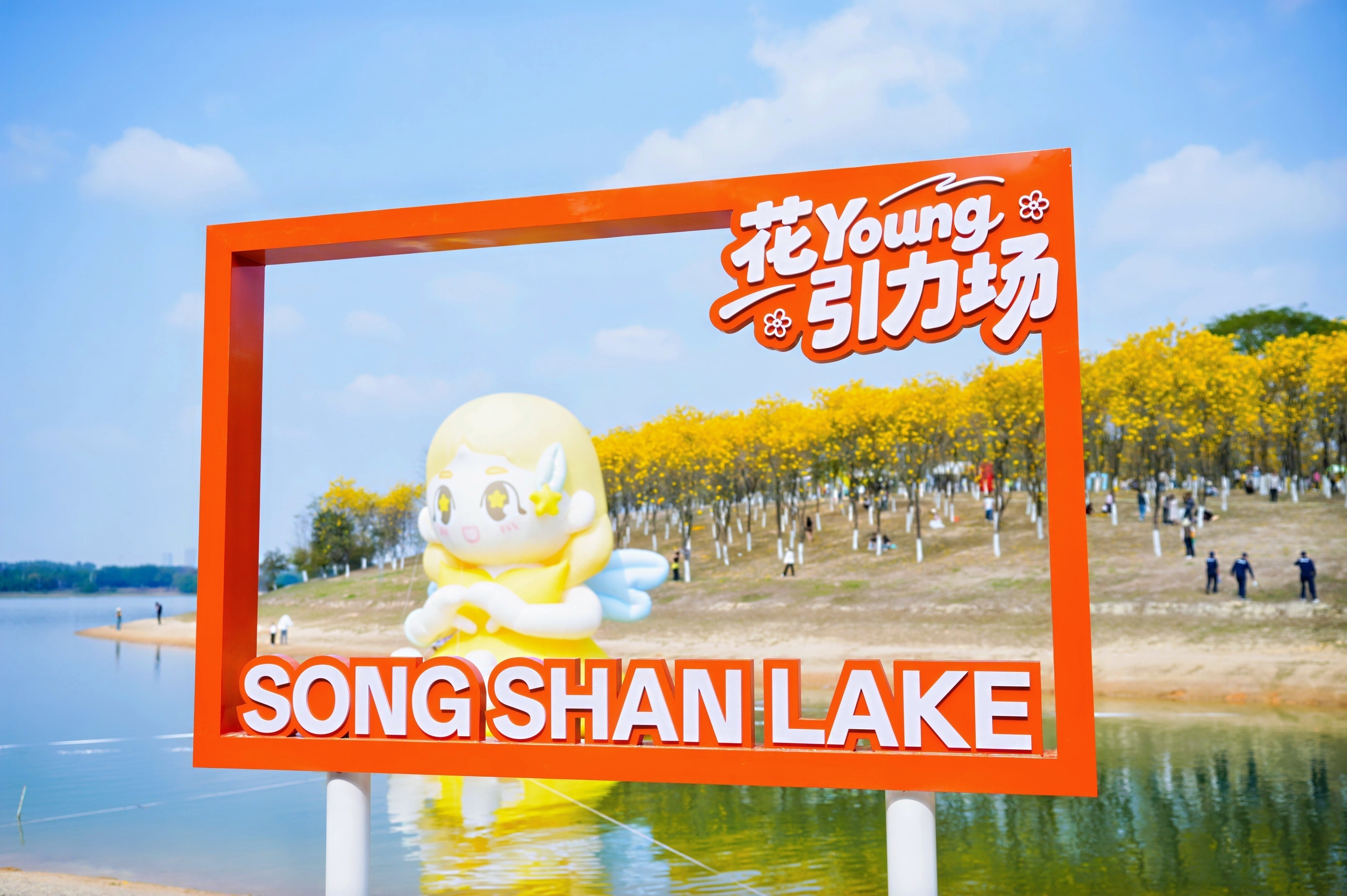 本届赏花月以「黄花仙子」为松山湖推荐官,在黄花风铃木林核心区域打造多款创意互动拍照装置,装置融合松山湖地标建筑元素,成为游客打卡出片的网红点位。