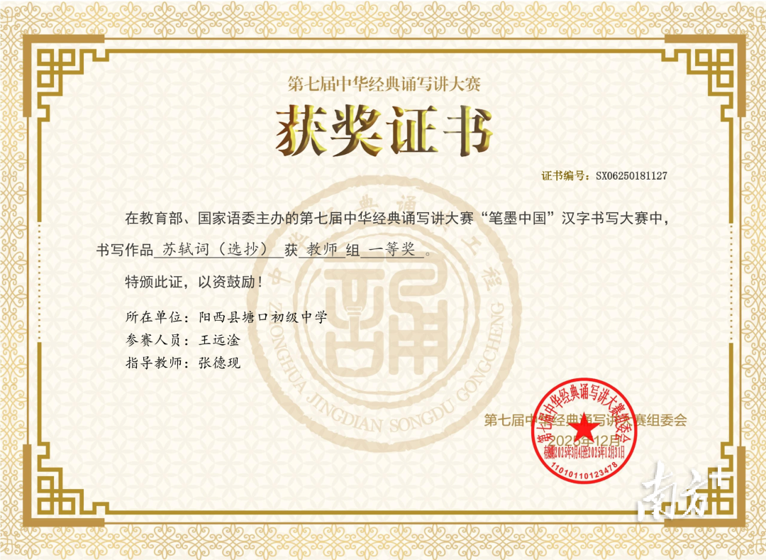 阳江持续创新活动载体,营造浓厚语言文字氛围。赛事上,在第七届中华经典诵写讲大赛国家级赛事中,阳江市师生共有6人获奖。其中,阳西县塘口初级中学教师王远淦作品《苏轼词(选抄)》获得“笔墨中国”汉字书写大赛教师硬笔组一等奖,实现了阳江在国家级奖项数量与质量双项新突破。