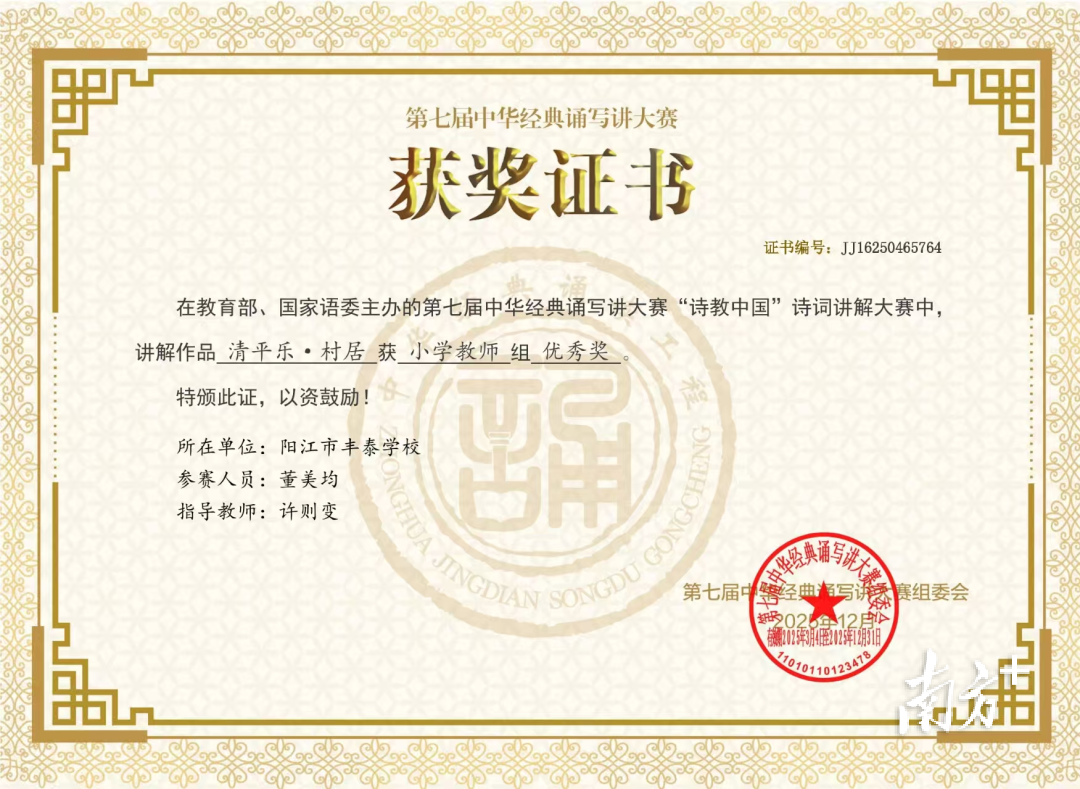 此外,阳江持续提升教师专业素养。举办全市语文骨干教师“中华经典诵写讲”大赛赋能专项培训,100名骨干教师参加4天集中面授,中国传媒大学、广东技术师范大学等省内外专家应邀授课,构建了“集中面授—跟岗实践—网络研修”三位一体培养闭环,为语言文字工作高质量发展夯实人才根基。