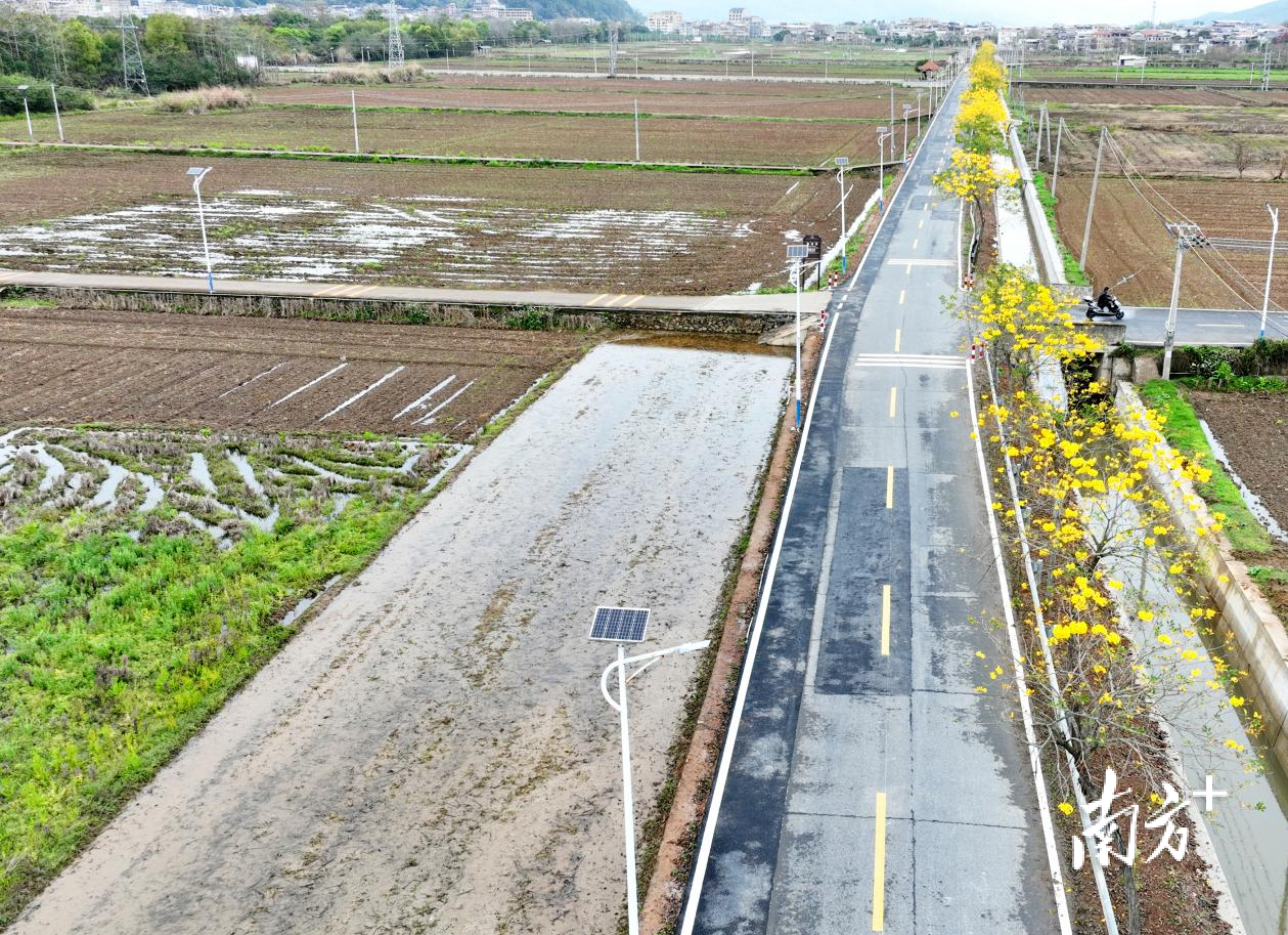 生态廊道串村联景,路景融合成效凸显。绿化建设持续向南延伸,打造至南山大桥全长4.2公里生态廊道,覆盖潘田、福岭、矮岭三个村庄,累计种植凤凰木500株、三角梅等花灌木1.6万余株,科学构建乔木、灌木、地被植物多层次搭配体系,形成四季有景、移步换景的绿色长廊,实现道路通行与生态景观有机统一。
