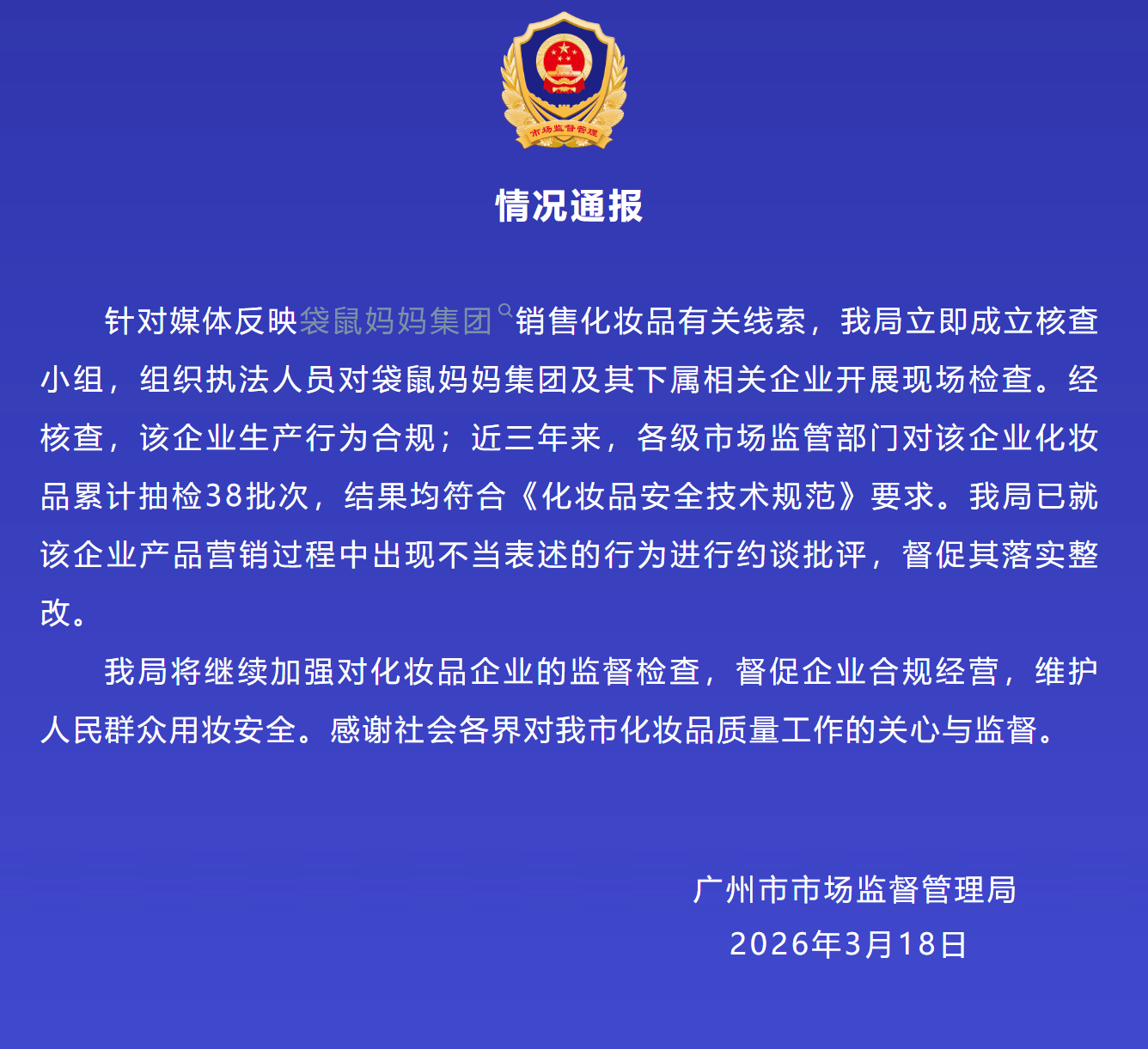3月18日,广州市市场监督管理局就“袋鼠妈妈产品营销表述不当”一事发布情况通报。针对媒体反映袋鼠妈妈集团销售化妆品有关线索,该局立即成立核查小组,组织执法人员对袋鼠妈妈集团及其下属相关企业开展现场检查。
