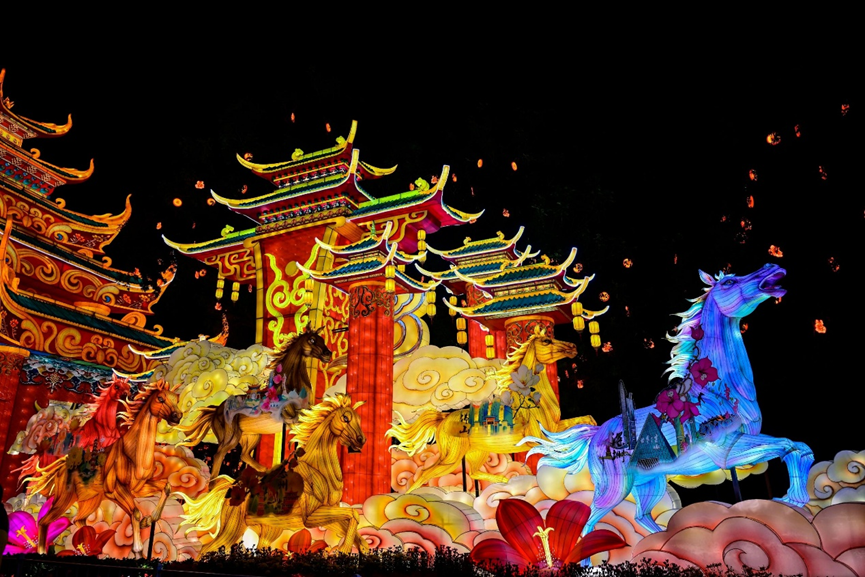 今年灯会重头戏是正门门楼《福马迎春》,融合骑楼拱券、趟栊门、满洲窗、广彩花瓶等广府元素,骏马昂首跃起呼应农历马年,寓意马上“橙”功、马上有“福”,灯组巧妙结合园区水景林木,营造“火树银花不夜天,流光溢彩映春色”的诗意画卷。