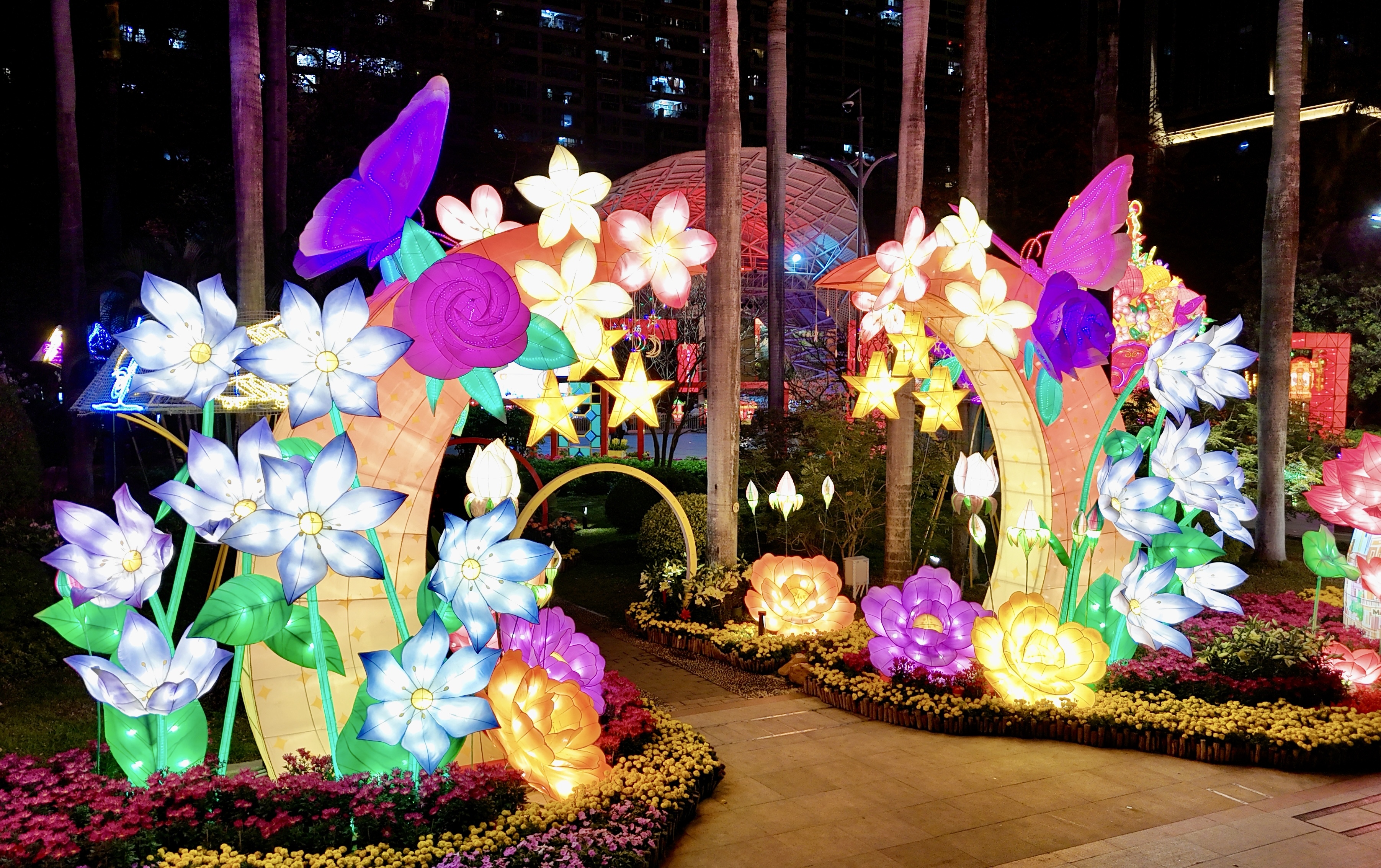 2026年广州文化公园迎春花会暨元宵灯会共展出22组花灯与园林景观相结合的特色灯组,搭配各类精品时花、桔果逾2.2万盆,延续“广州过年、花城看花”的特色传统。