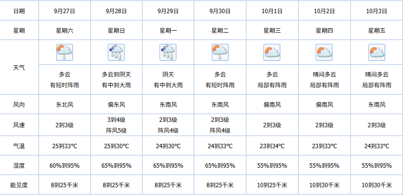 预计,28日至29日受台风“博罗依”外围环流影响,有一次大雨局部暴雨降雨过程;30日起降雨减弱。展望国庆假期前期(10月1日至3日)晴间多云为主,局部有阵雨。