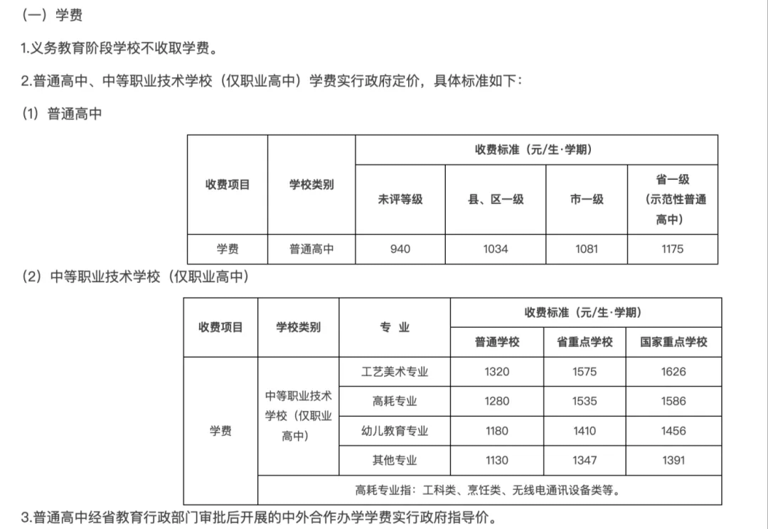 《通知》明确,义务教育阶段学校不收取学费。普通高中、中等职业技术学校(仅职业高中)学费实行政府定价,其中普通高中的具体学位标准为:未评等级的普通高中学费为940元/生·学期;县、区一级普通高中学费为1034元/生·学期;市一级普通高中学费为1081元/生·学期;省一级(示范性普通高中)普通高中学费为1175元/生·学期。