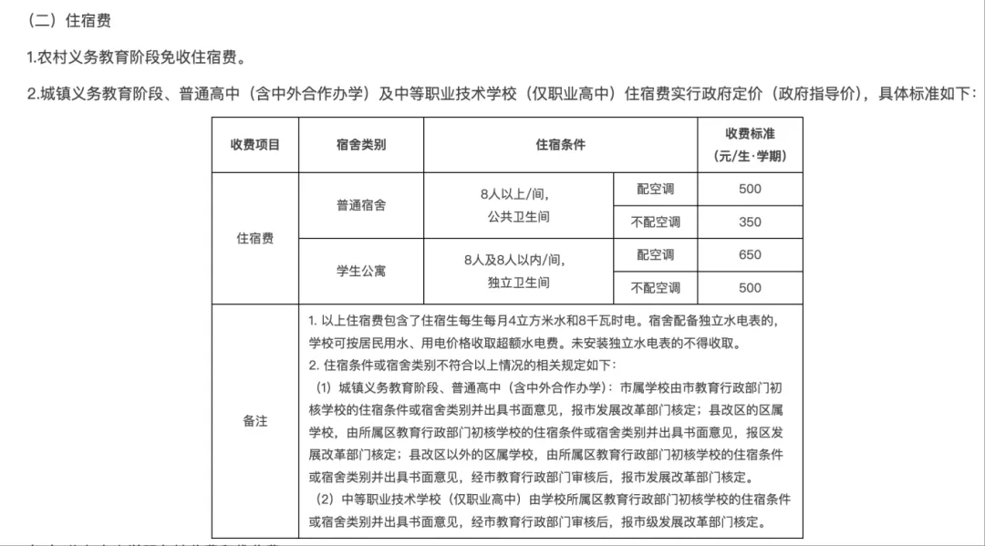 农村义务教育阶段免收住宿费。城镇义务教育阶段、普通高中(含中外合作办学)及中等职业技术学校(仅职业高中)住宿费实行政府定价(政府指导价)。具体标准如下: