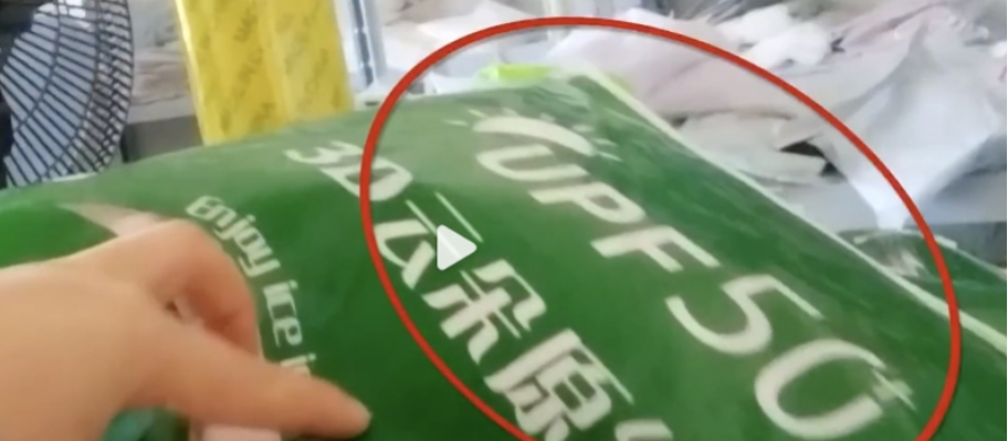 防晒衣包装上印着“UPF50+”的标识。据曝光,在江西上饶弋阳县信丰服装加工厂,一些所谓的防晒衣不仅未标注产品名称、厂名、厂址等信息,防晒衣包装袋上却印着“UPF50+”的标识。公司有关人员称,消费者不会拿去检测,数值怎么写都行。他们还可根据客户需求,随意定制外包装袋上的防晒指数标识。