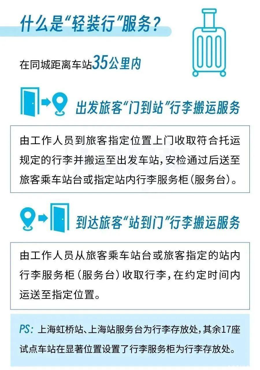 在同城距离车站35公里内,旅客根据实际需要可选择以下两种“轻装行”服务: