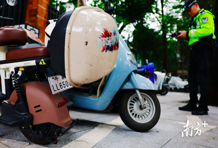 6月20日上午,广州市公安局交警支队越秀大队在烈士陵园地铁站附近,对有违法行为的电动自行车驾驶人进行教育劝导及执法处罚。记者在现场看到,部分电动自行车因未悬挂车辆号牌或使用假牌而被暂扣。