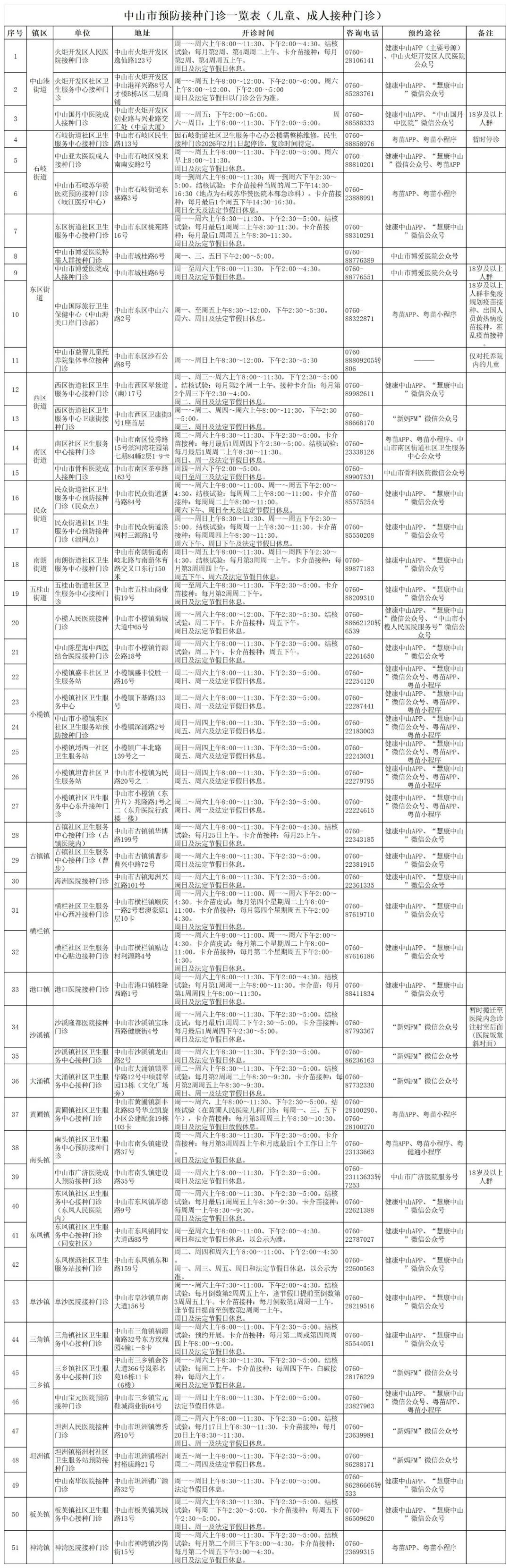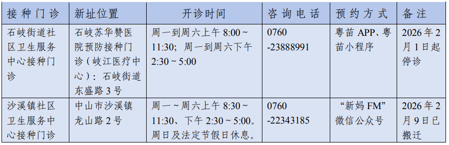 @中山市民朋友:近期,石岐街道和沙溪镇社区的卫生服务中心接种门诊整体装修或搬迁,服务地址变更如下:1.石岐街道社区卫生服务中心接种门诊停诊,市民可到石岐苏华赞医院预防接种门诊(岐江医疗中心)接种疫苗,地址:石岐街道东盛路3号。2.沙溪镇社区卫生服务中心接种门诊新地址:中山市沙溪镇龙山路2号(龙山中学旁)。开诊时间和预约方式见下表: 编辑 朱晓宇 订阅后可查看全文(剩余80%)