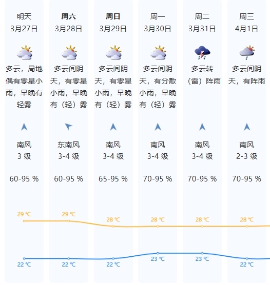 预计27-30日多云为主,早晚有轻雾或雾,间中有分散阵雨;展望31日-4月1日有雷雨天气过程。
