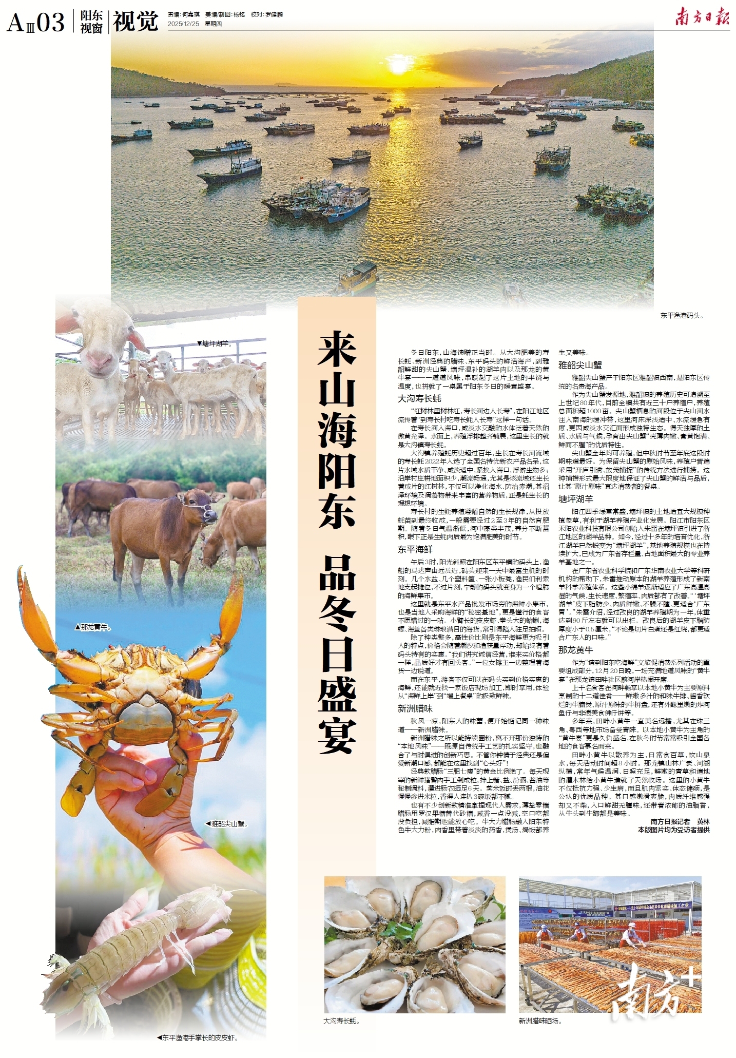 冬日阳东,山海馈赠正当时。从大沟肥美的寿长蚝、新洲经典的腊味、东平码头的鲜活海产,到雅韶鲜甜的尖山蟹、塘坪温补的湖羊肉以及那龙的黄牛宴——一道道风味,串联起了这片土地的丰饶与温度,也拼就了一桌属于阳东冬日的暖意盛宴。