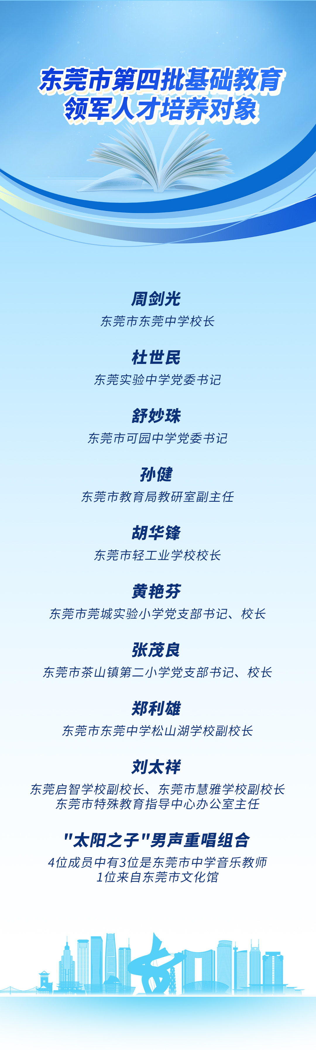 牢固树立正确育人观,奋力推进教育强市建设,2025年,东莞市出台《推进教育强市建设三年行动计划(2025-2027年)》,全面实施“莞邑强师”工程,并启动了第二轮基础教育领军人才培育工作,评选出第四批基础教育领军人才培养对象10人、教育家型校长和教师培养对象50人。10名基础教育领军人才培养对象,名单如下↓↓↓