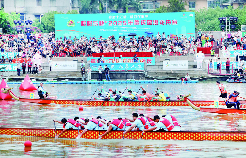 今年端午期间,“喜迎十五运 逐梦大湾区”主题龙舟赛在星湖上演,32支队伍劈波斩浪,岸边观众的呐喊声此起彼伏。“在家门口就能看高水平龙舟赛,近距离感受大湾区的运动活力,特别有意义!”市民陈先生带着孩子挥舞着国旗,为选手加油。