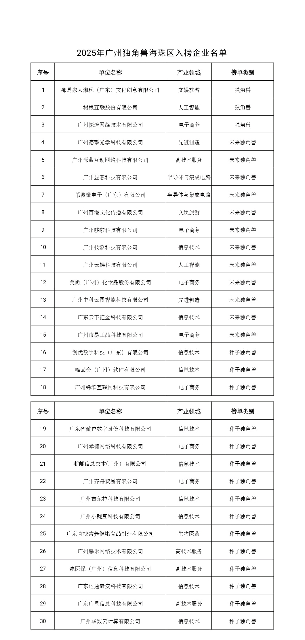 近日,广州市科技局发布《2025年广州独角兽企业榜单》。在这份反映城市创新活力与产业潜力的榜单中,海珠区共有30家企业入选,数量位列全市前三。