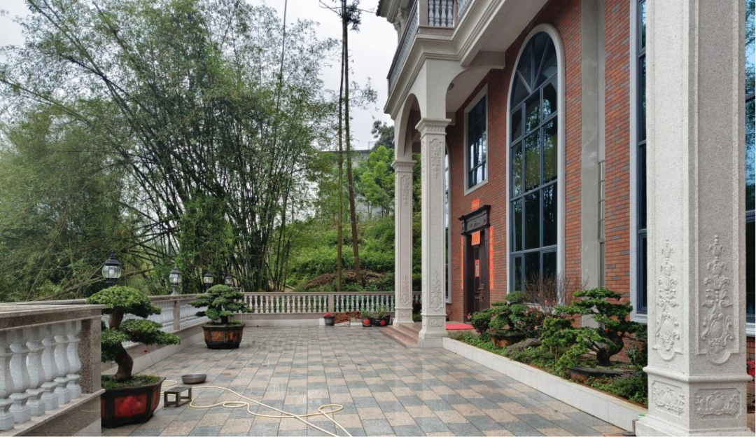 袁惠芳庭院假山流水景致灵动,青石板+透水砖地面美观实用。休闲区石凳木椅齐全,庭院定期养护无杂物,清新雅致的氛围超适合家人休憩。